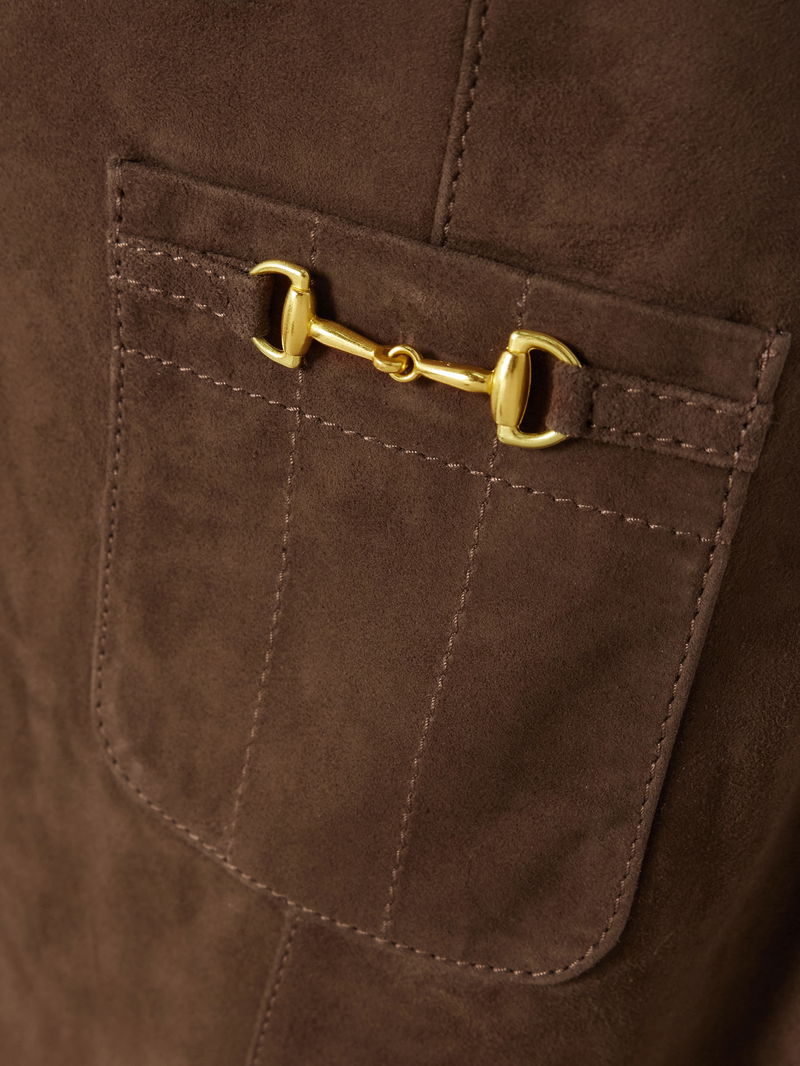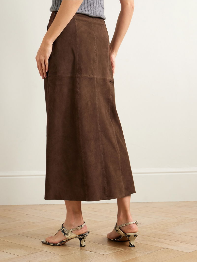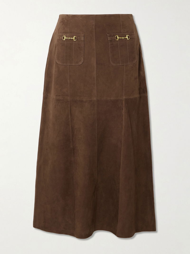 Orlagh McCloskey and Henrietta Rix's love of vintage is felt in every RIXO design. This 'Edwina' midi skirt is made from panels of soft, supple suede in a high-waisted, A-line shape. Match your jewelry to the retro gold-tone horsebit hardware.