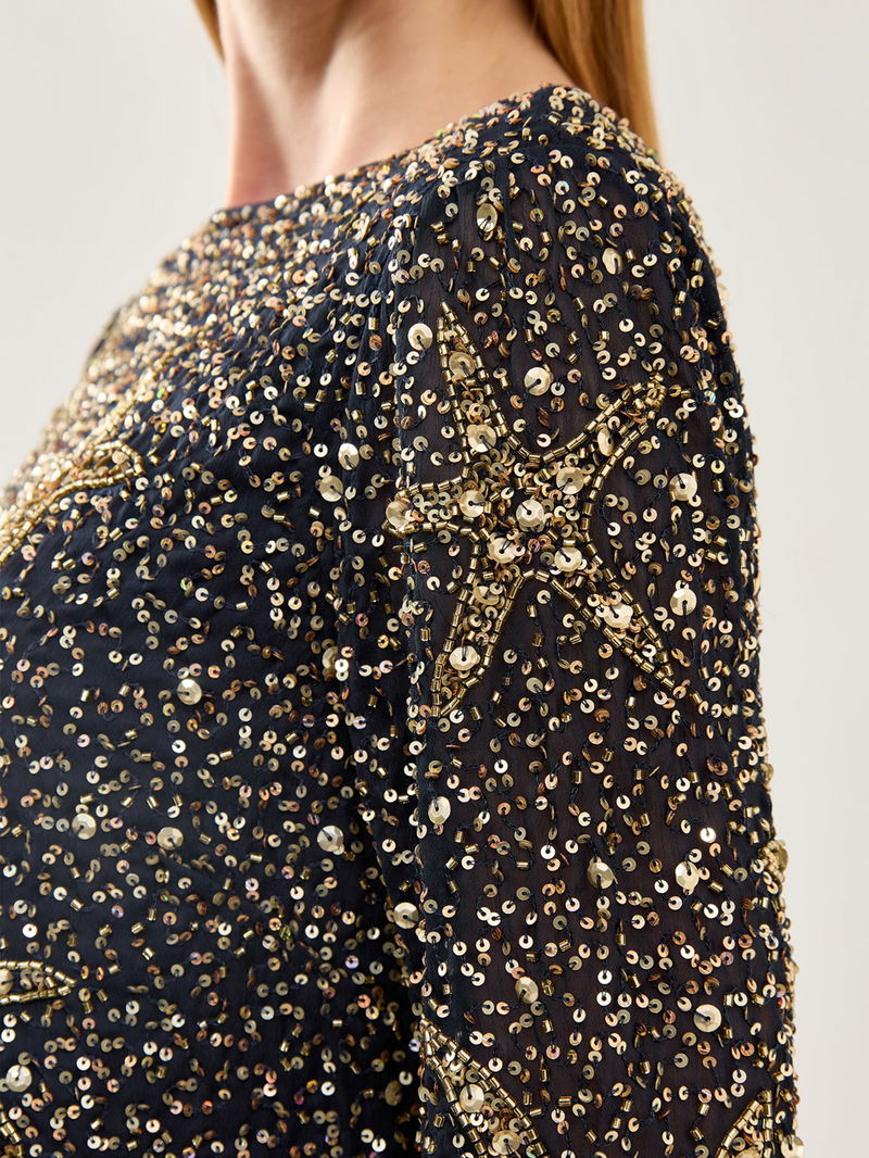 Rixo’s Ilse dress is hand-embellished with starfish motifs across navy fabric. Designed with a flattering cut and fluid drape, it captures the brand’s distinctive vintage-inspired aesthetic, offering a refined choice for occasionwear with playful detail.