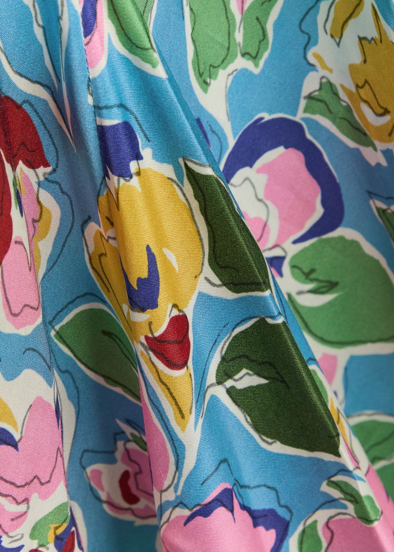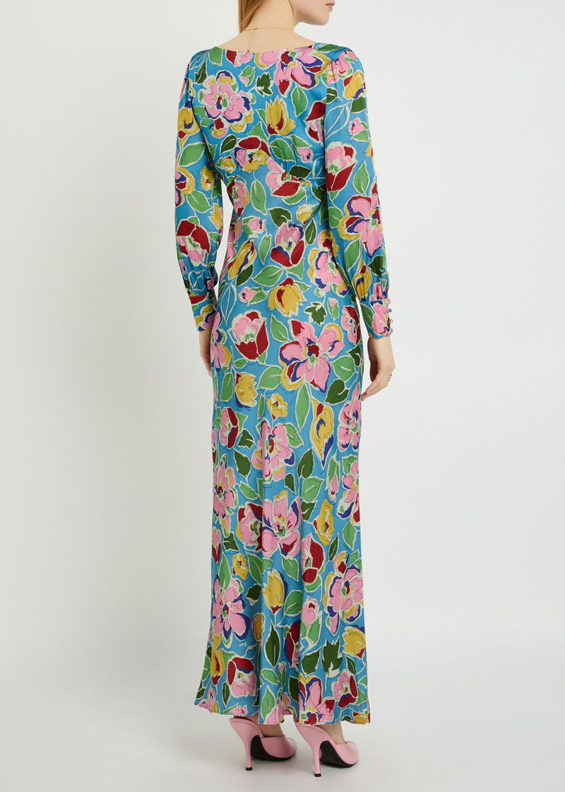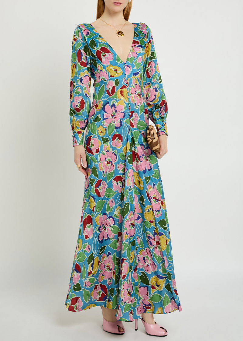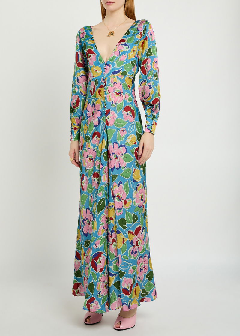 Rixo satin dress. Floral print, V-neck, button-fastening cuffs, button fastenings at front.