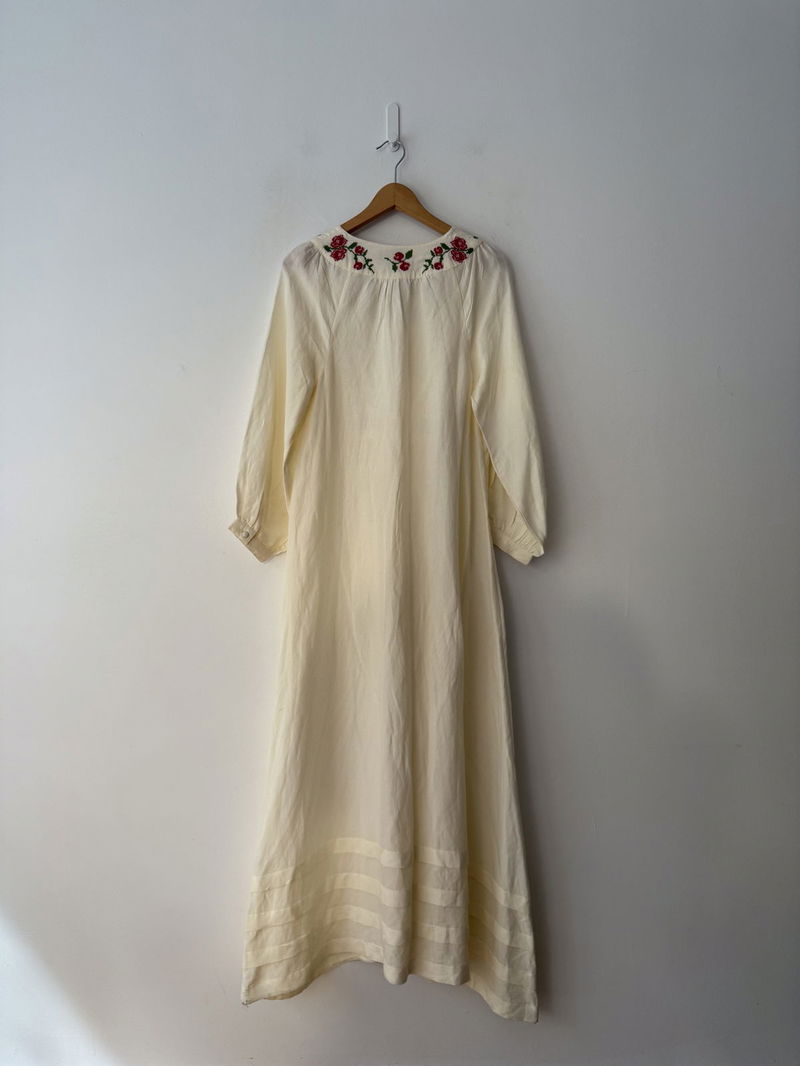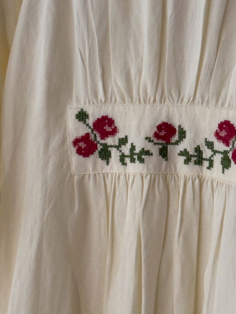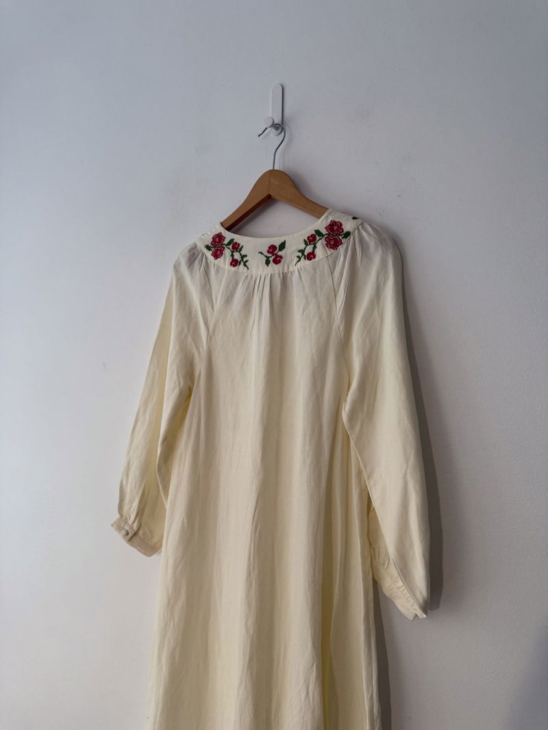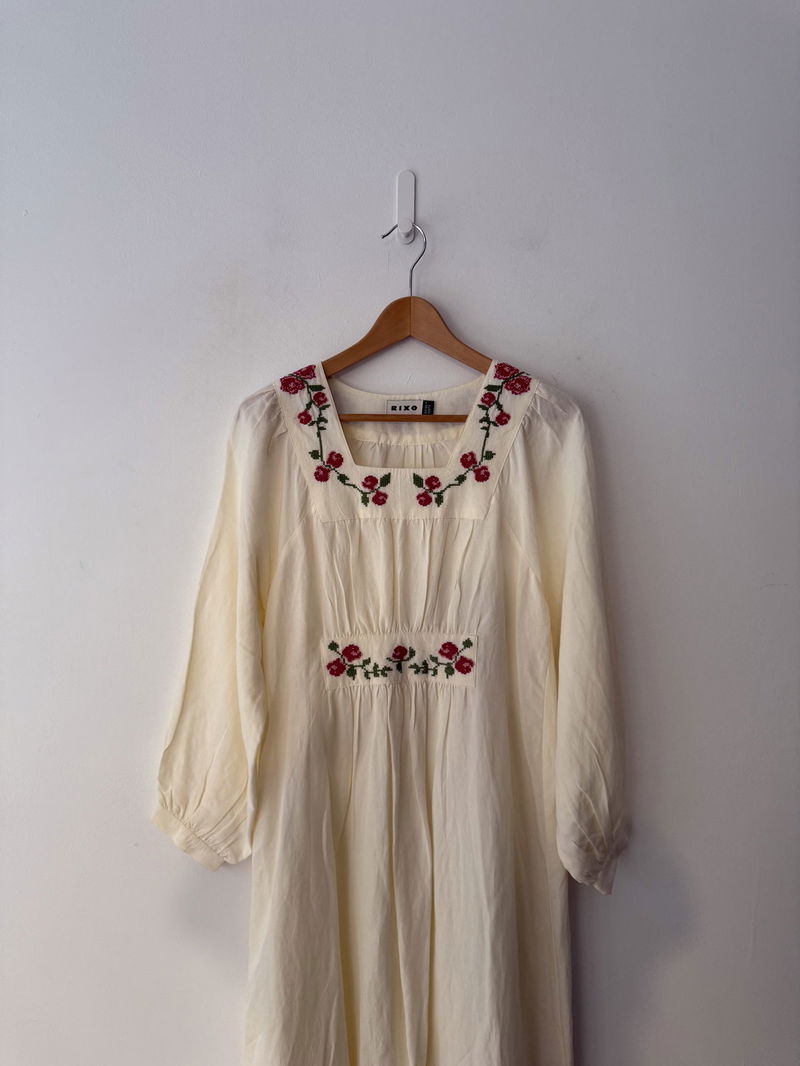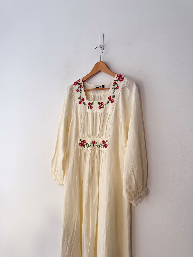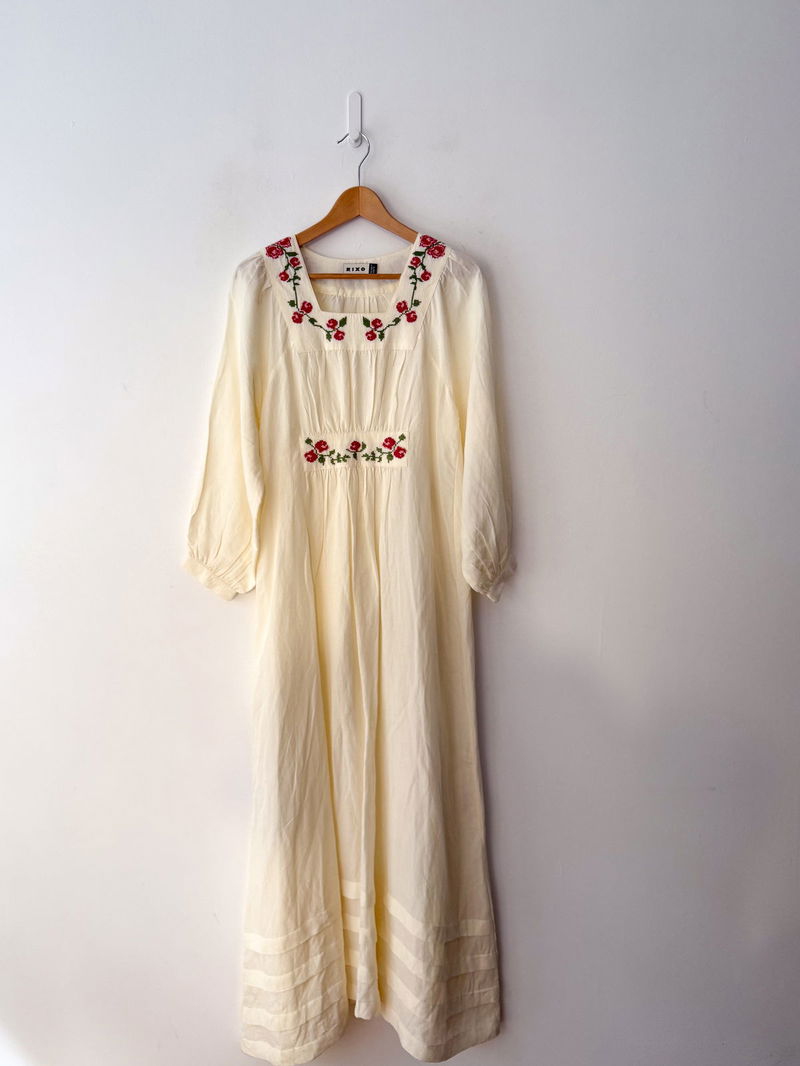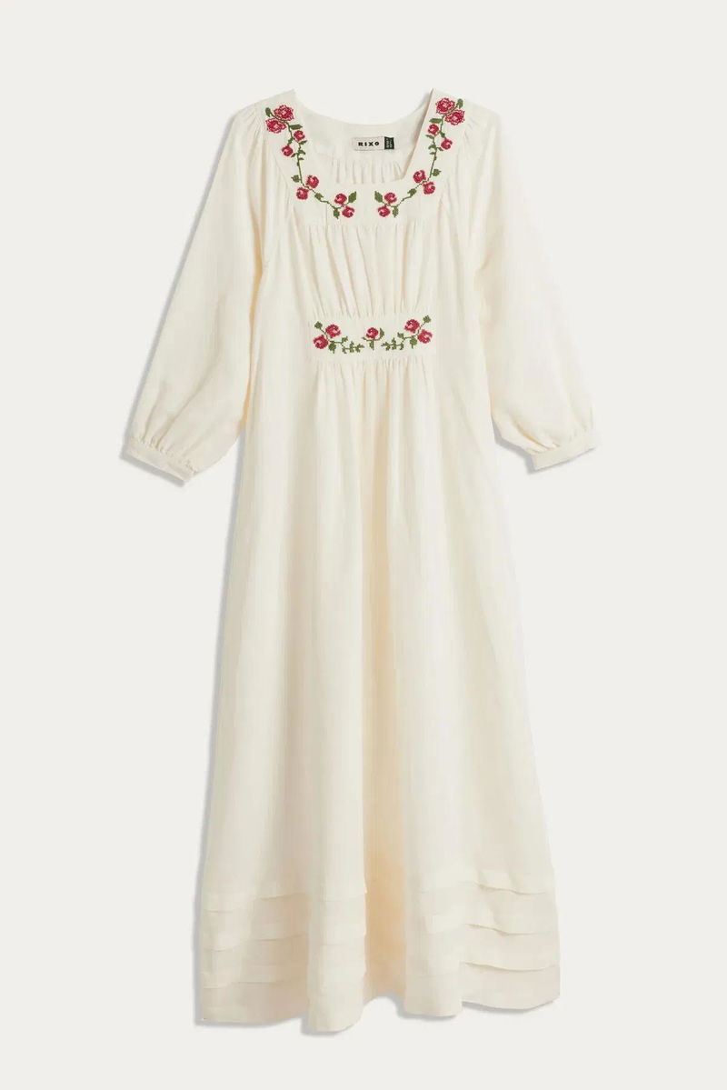 Meet our beautiful Neila dress in ivory from RIXO's exclusive collaboration with Billie Bhatia. Made from linen-blend, its intricate floral embroidery and airy 1970s inspired shape is both charming and perfect for every day.