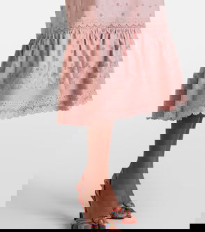 It's made from broderie anglaise cotton with pretty floral appliqués and has a pleated top, reminiscent of styles from the 1950s. The ruffled lace trims are delicate and feminine.