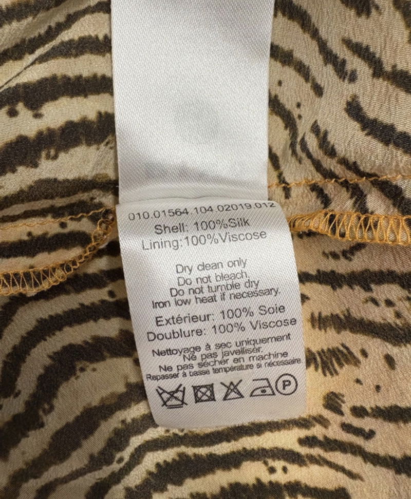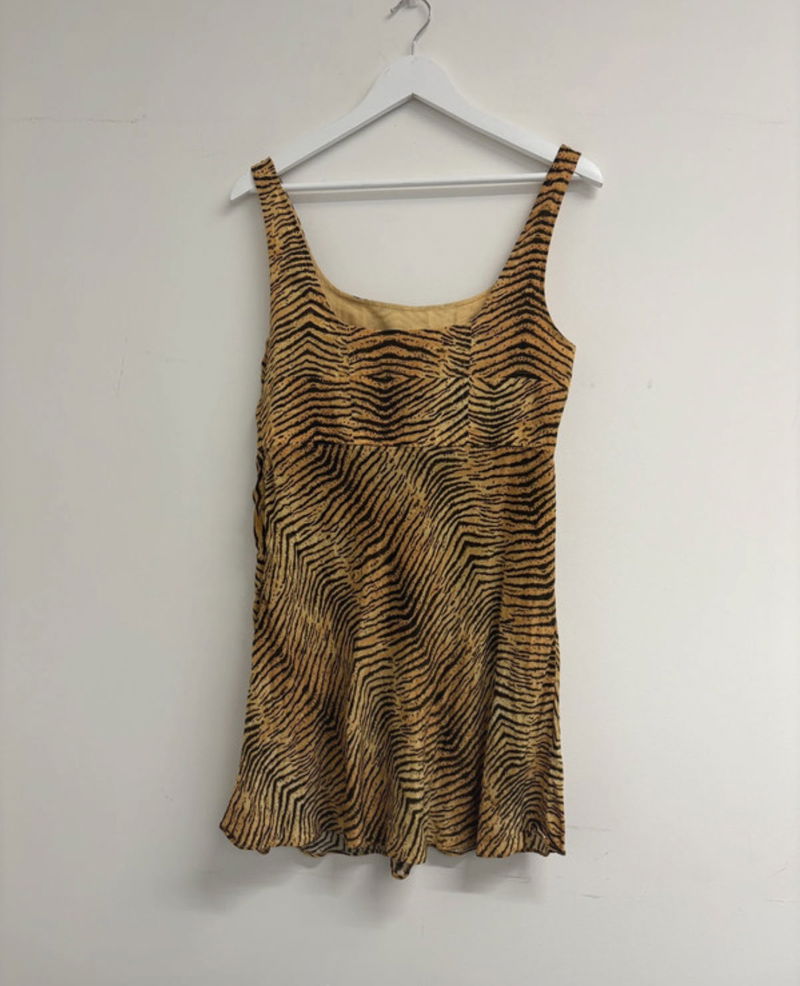 Dress, Tiger-print, Silk crepe de chine, Concealed hook and zip fastening at side, Non-stretchy fabric, Lightweight fabric.
