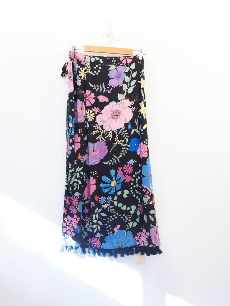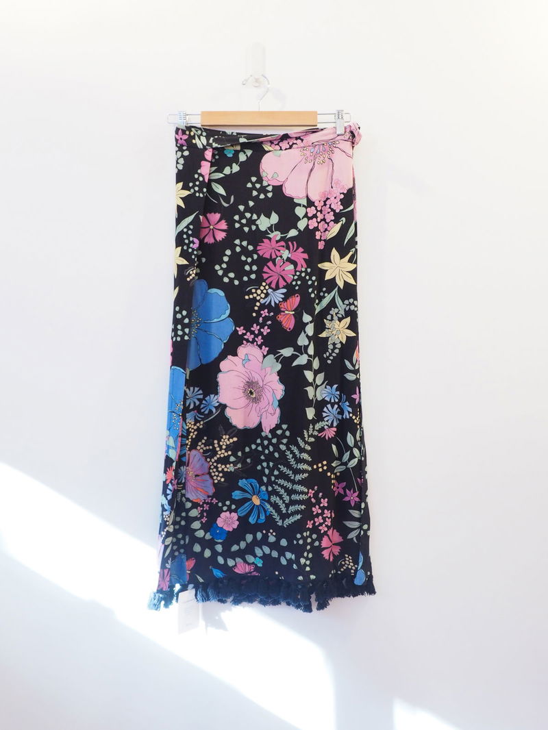 RIXO x Billie Bhatia. The Parisa wrap skirt is the ideal mix and match summer staple with a bohemian spirit. Its vintage-inspired floral print and cotton tassels at the hem is made for warm weather days.