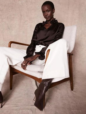 Blouse, Silk-satin, Ruffled, Button-fastening keyhole at back, Mid-weight, non-stretchy fabric.