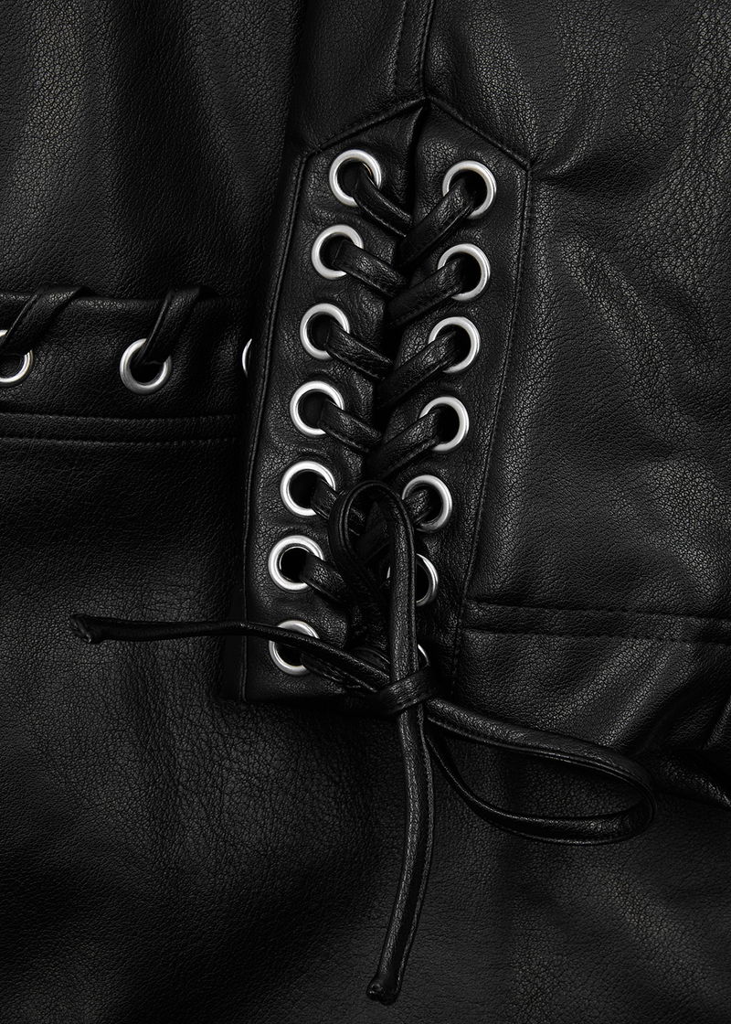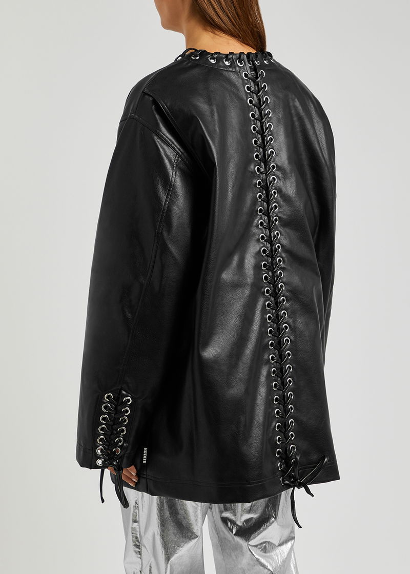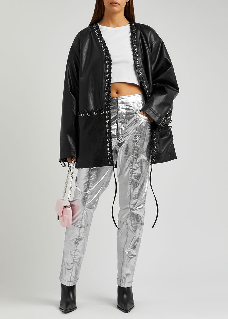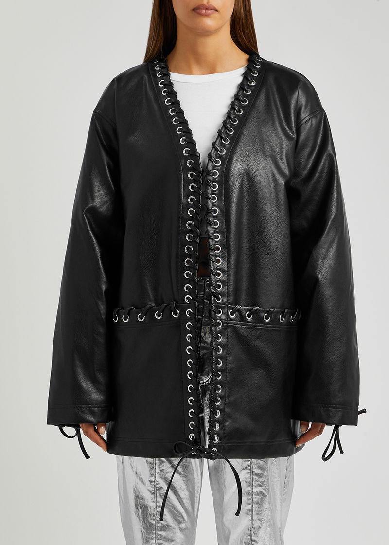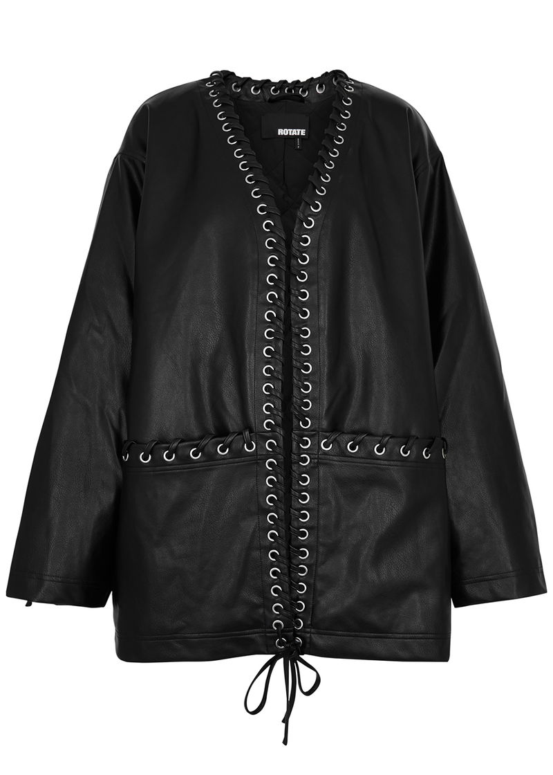 Rotate Birger Christensen faux leather jacket V-neck, dropped shoulders, two front patch pockets, eyelet and whipstitch details at trims and back, designer tag at side, tie-fastening cuffs, quilted lining.