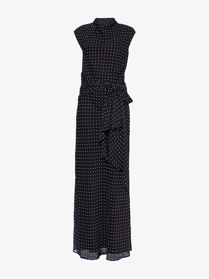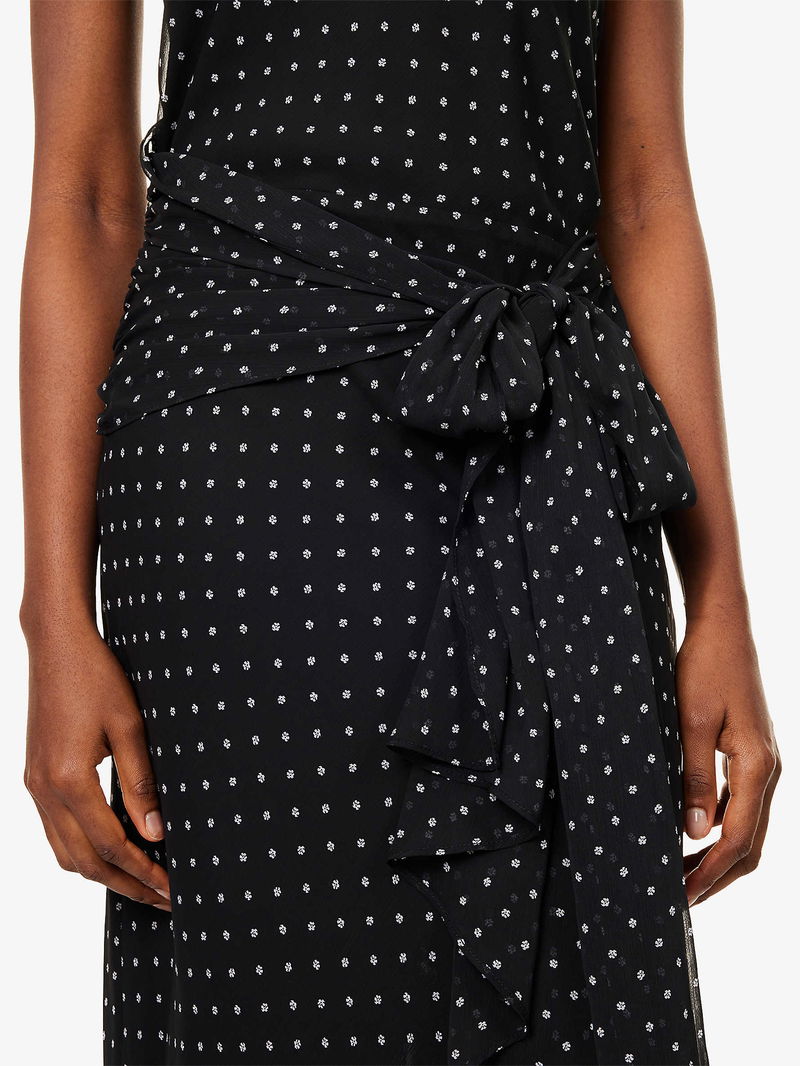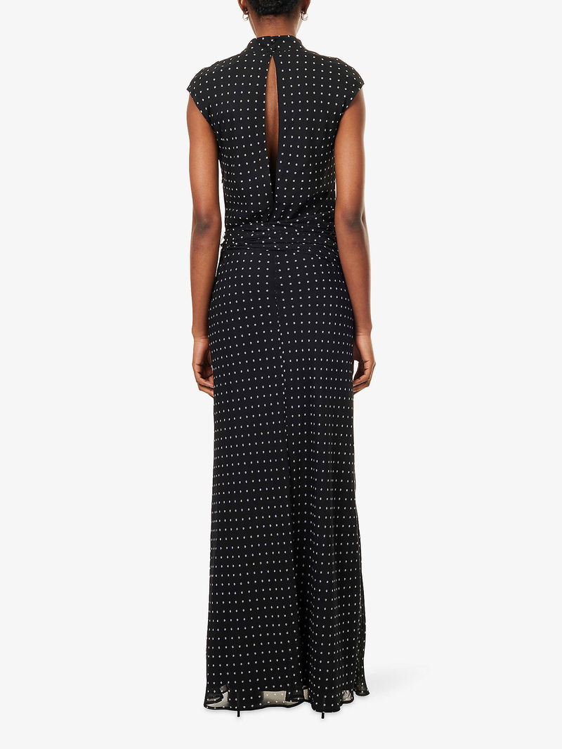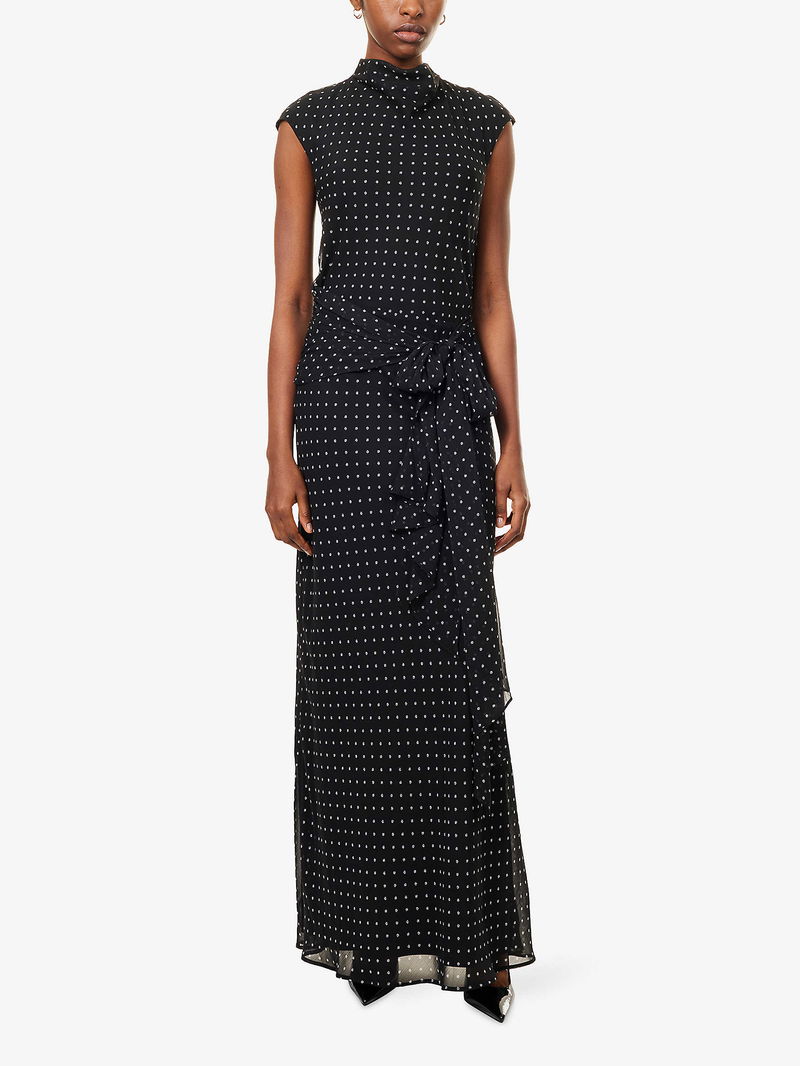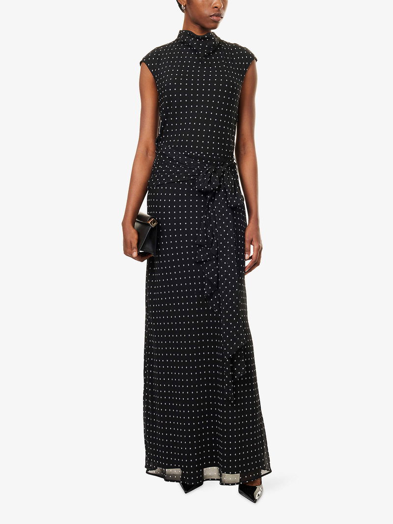 ROTATE Birger Christensen woven maxi dress. Concealed zip fastening at side. Regular fit, high neck, sleeveless, self-tie fastening at waist, keyhole cut-out at back, all-over floral print, fully lined, maxi length.