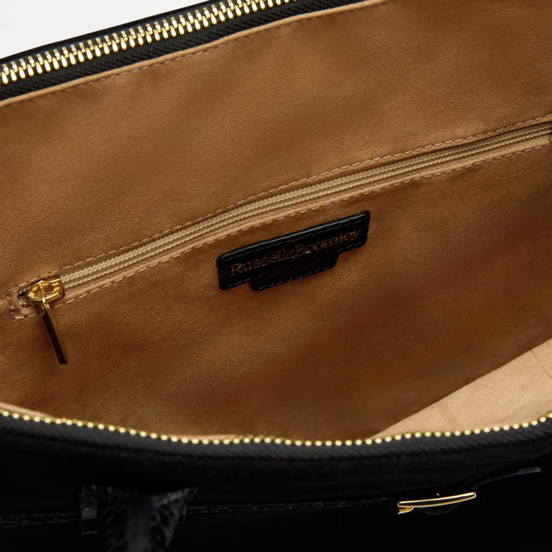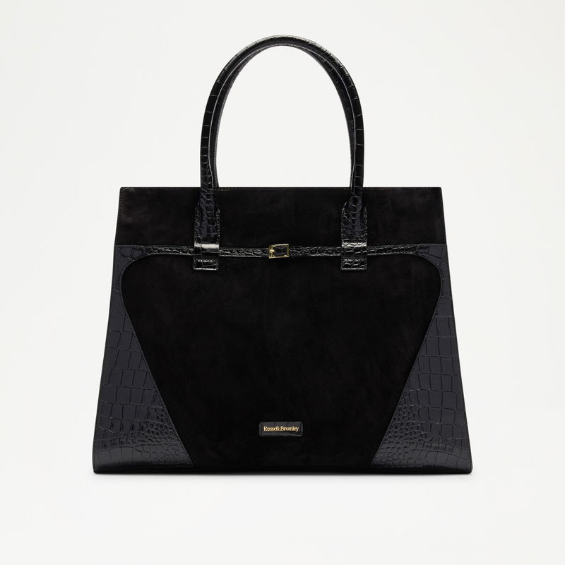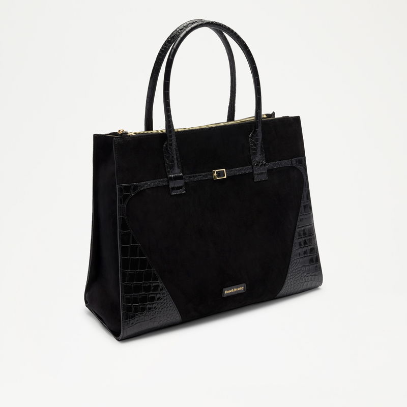 The Cholrton Tote brings premium leather finishes and hardware to the classic structured tote. Soft suede is framed with crocodile print leather and finished with a belted gold buckle trim. Inside, three compartments offer considered organisation, refined and built for purpose.