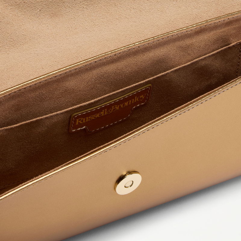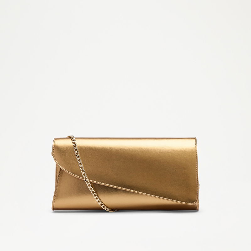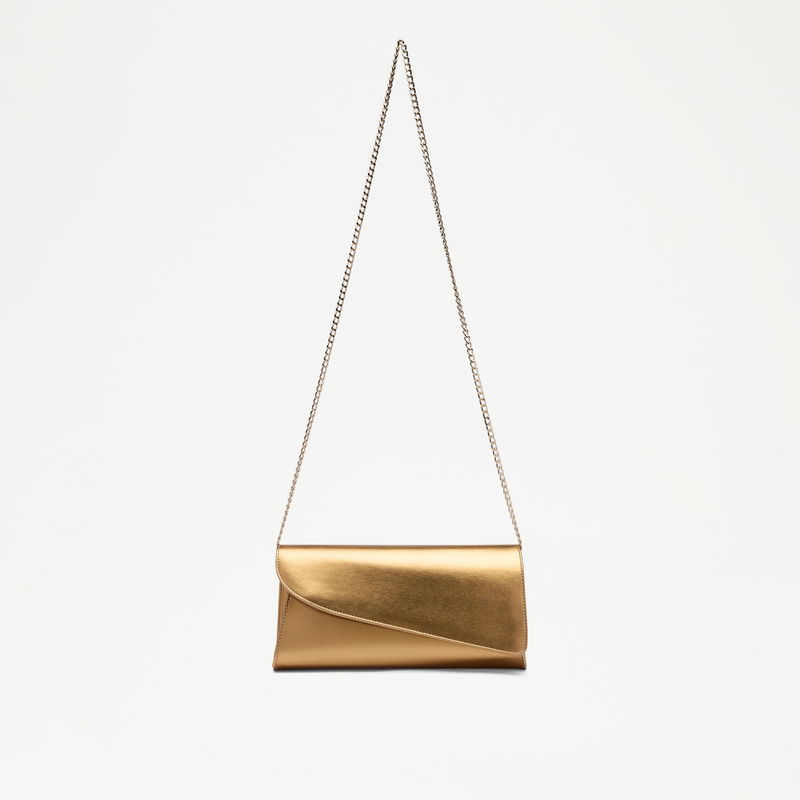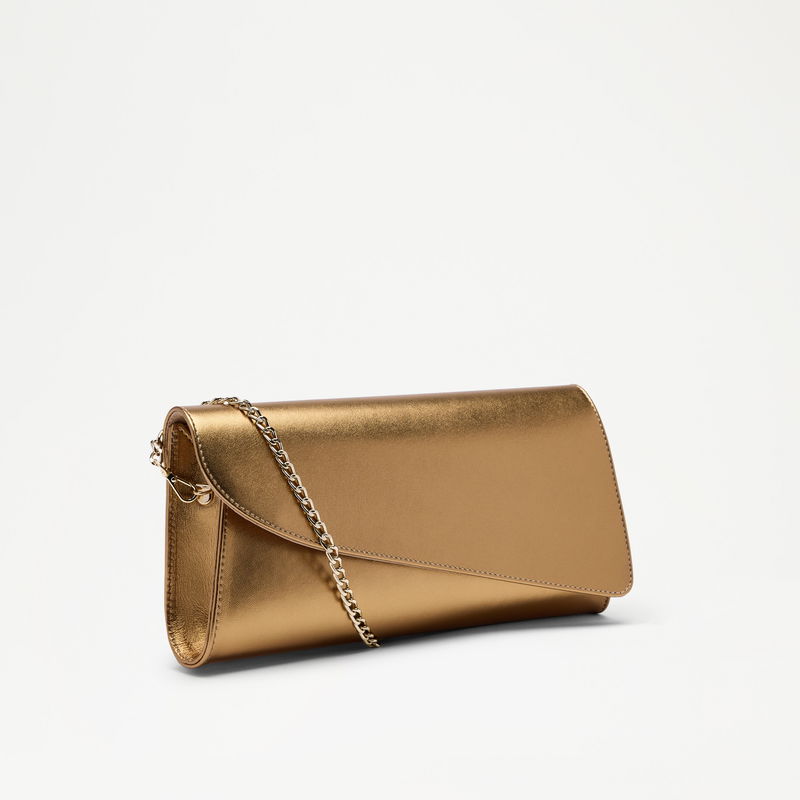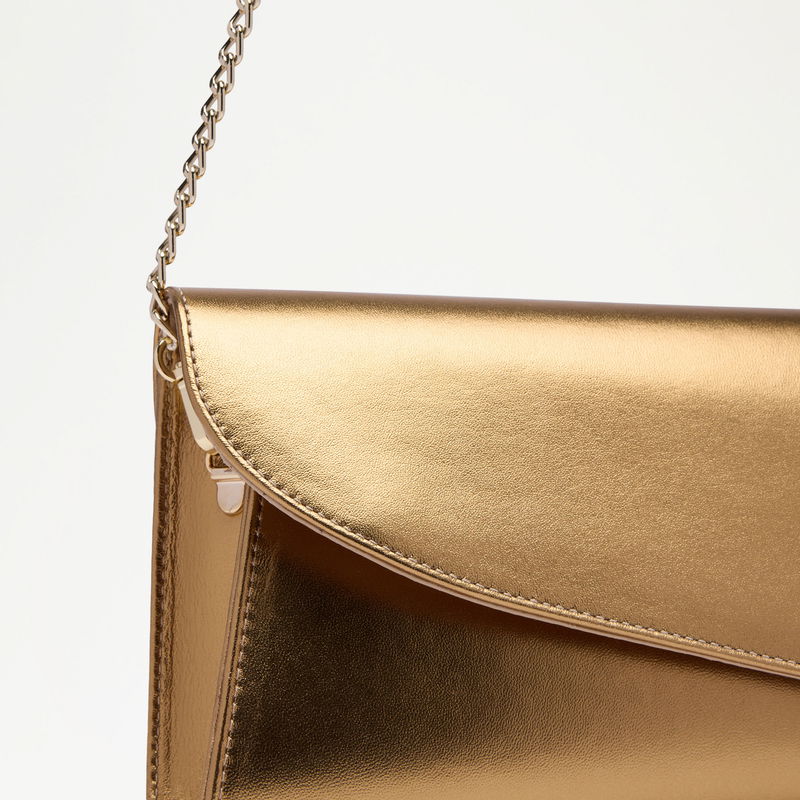 Colby reimagines the classic clutch with a sculpted edge. Finished with a detachable chain, it transitions seamlessly from handheld to shoulder or crossbody. Crafted in gold leather, Colby is designed to pair back to key party heels across the collection.