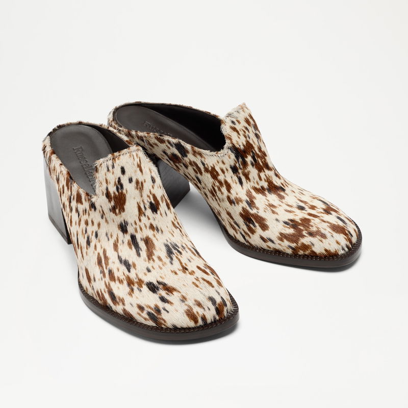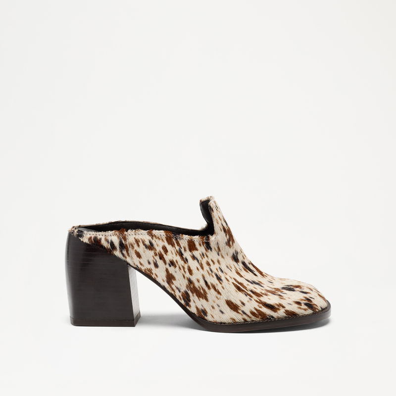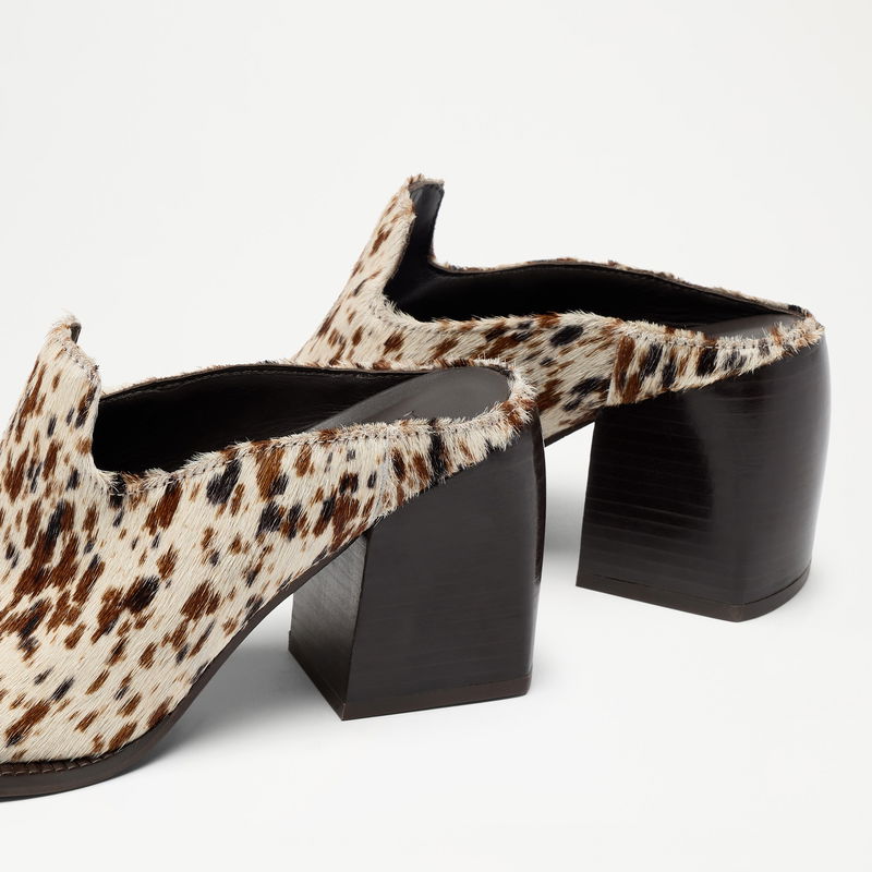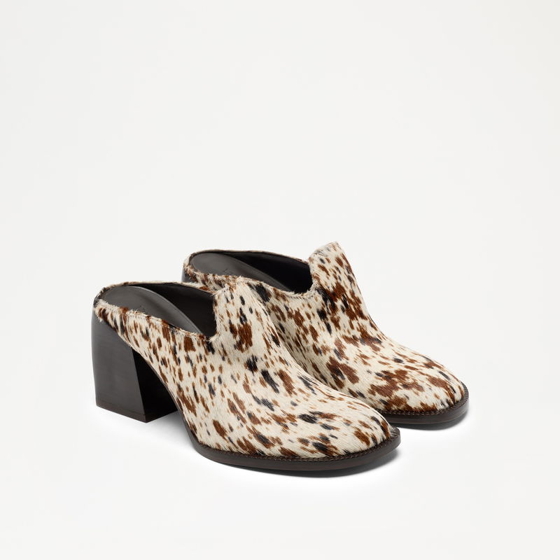 The Gatley Mule blends sculptural western design lines with transitional weather versatility. Defined by a rounded, slightly asymmetric toe the silhouette is set on a tonal block heel with a soft curved finish. The high line offers added coverage for cooler seasons, while the dark brown leather and speckled hair calf options bring texture and depth to the style. Please Note: This distinctive material is printed by hand using a flicking technique, creating a naturally irregular pattern across the surface. Variations in density and lightness are intentional, making each skin unique. Used across multiple silhouettes this season, the speckled finish brings contrast and character to every silhouette. While we work to achieve balance and consistency within each pair, natural variation remains part of the process. This is the mark of a hand-finished material – no two pairs will be exactly the same, and that’s precisely the beauty of it.