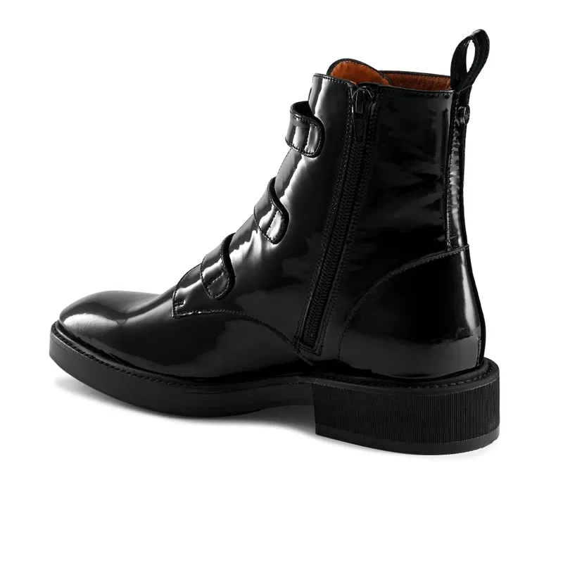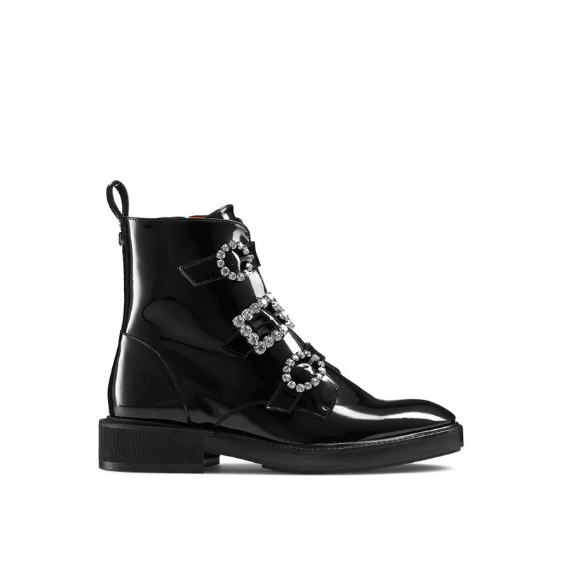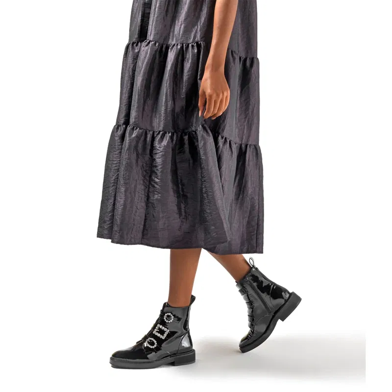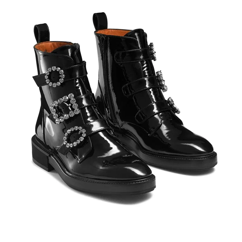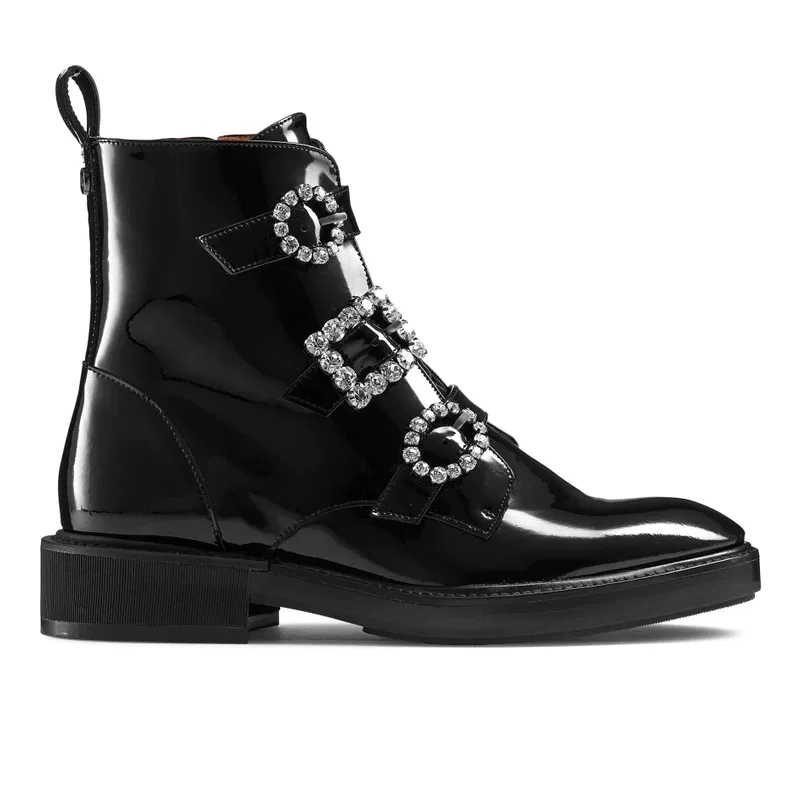 The aptly named Glamorous is a chic take on this season's biker boot trend. Crafted in Spain from glossy black patent leather, this boot has been detailed with an inside zip fastening and has been set on a chunky sole. Adorned with sparkling gem buckle trims, we love this style when worn as a contrast against a ruffled dress and puff sleeves.