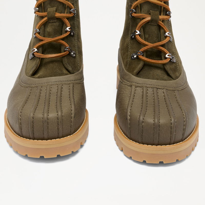Haltcliffe is a modern take on the classic duck boot, originally designed for wet-weather adventure. Crafted in Portugal it features leather and suede with contrast laces, ski hook hardware, and a bold sole, it’s built for festival days, unexpected weather, and off-duty exploring.