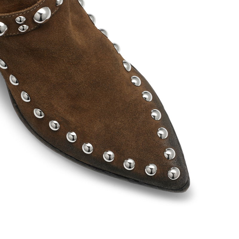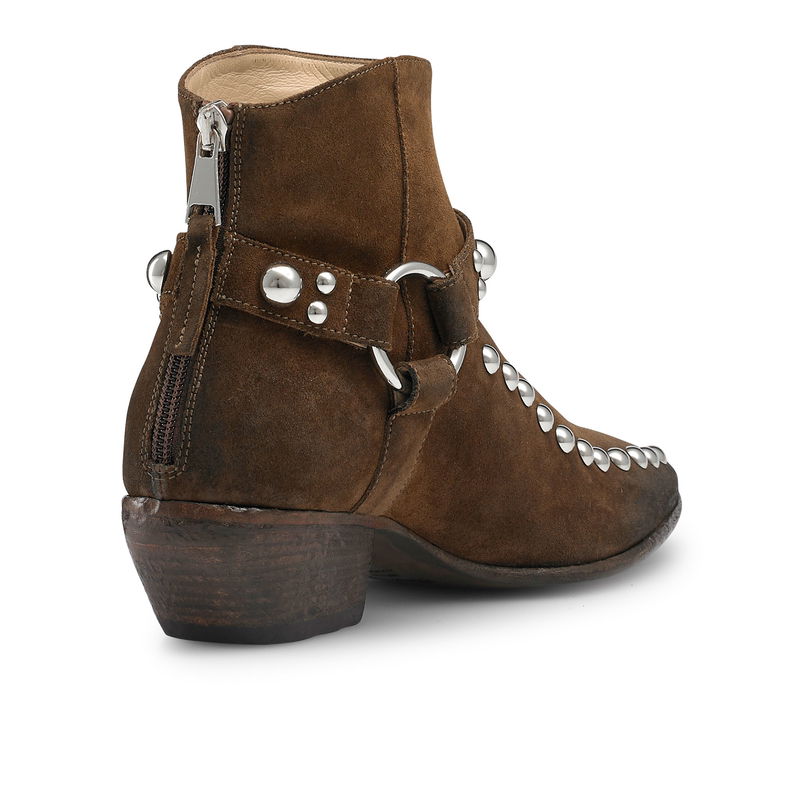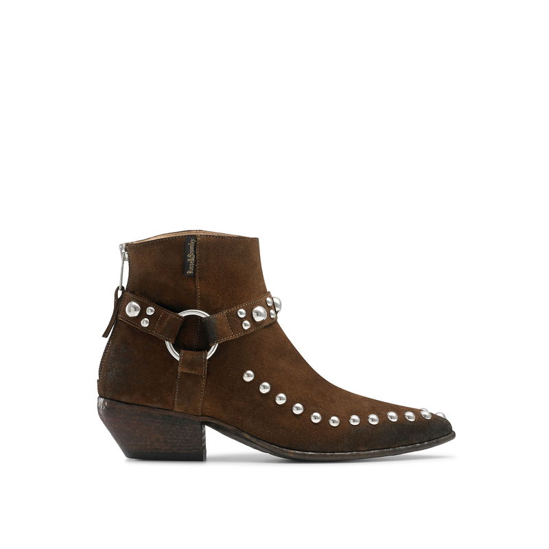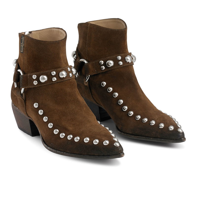 Ramp up the glam factor this season with Harness, Russell And Bromley's decadently embellished western boot. Crafted in Italy from soft-touch tan suede, this showstopping style references this season's hot-topic western trend. Inspired by the iconic western boot silhouette, the design is ready for weekend and party dressing thanks to its metallic ring detail and stud-adorned harness straps. The piece comes complete with a small stacked heel and leather lining.