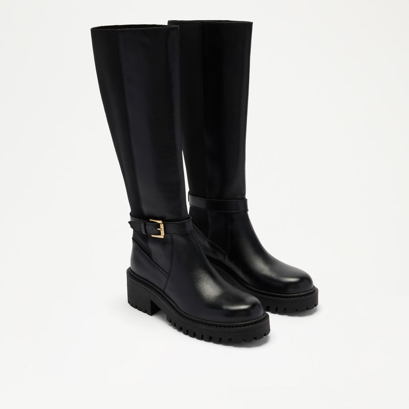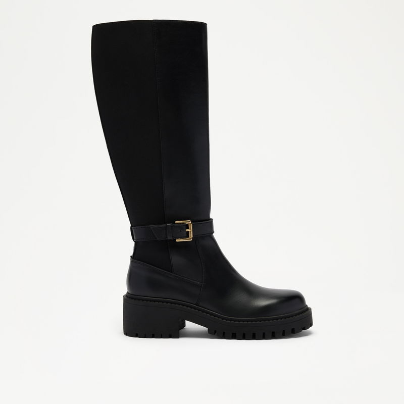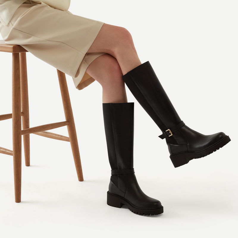 Kickstart your day on the right foot. Featuring elasticated backing detail, a cleated sole and gold hardware ankle strap, this knee high Chelsea boot is designed for modern style and durability. Ideal for everyday wear.