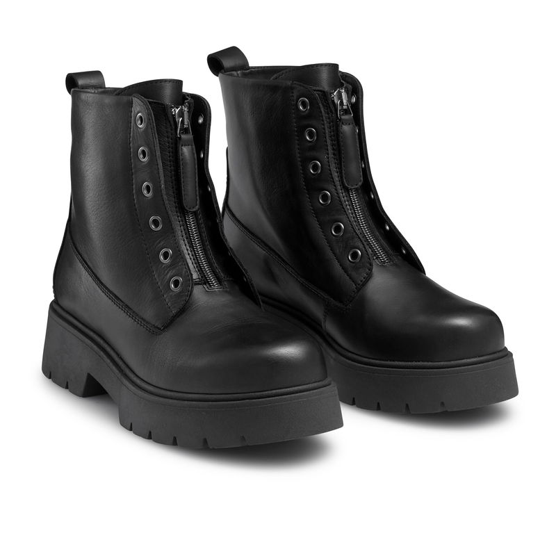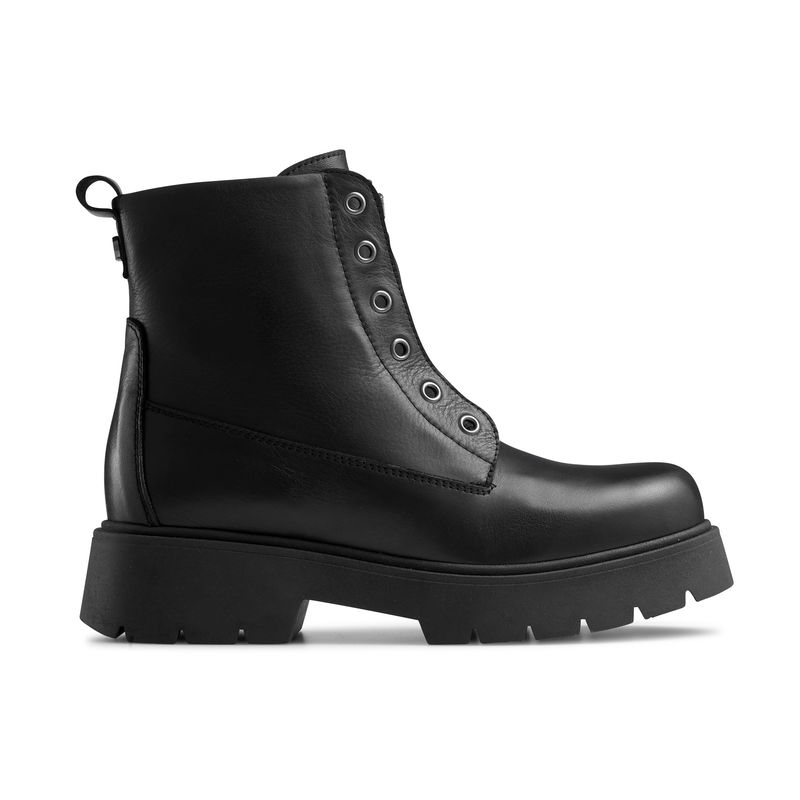 Forget the style rules this season and embrace hybrid design with Rebel, our laceless zip-front boot. This intriguing style has been handcrafted in Italy from black calf leather, and made to look like a classic lace-up ankle boot. But this time, without the laces. Slip into this unexpected style with ease thanks to its leather pull tabs, which have been secured with logo-adorned studs. The piece is fully leather lined and comes on a grooved rubber sole, with a zip front fastening and pewter-hued hardware. Fits roomy over toes.