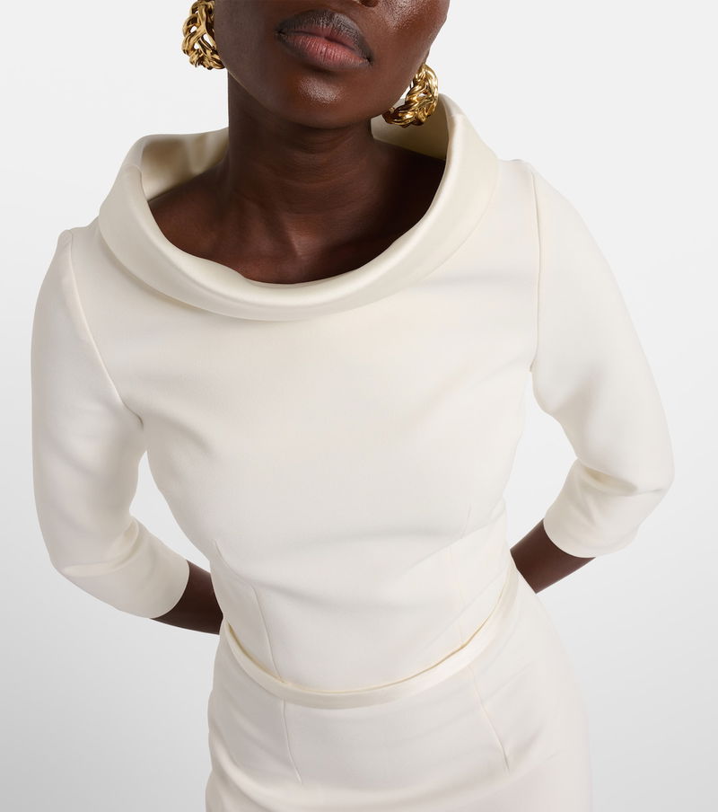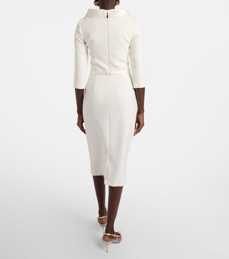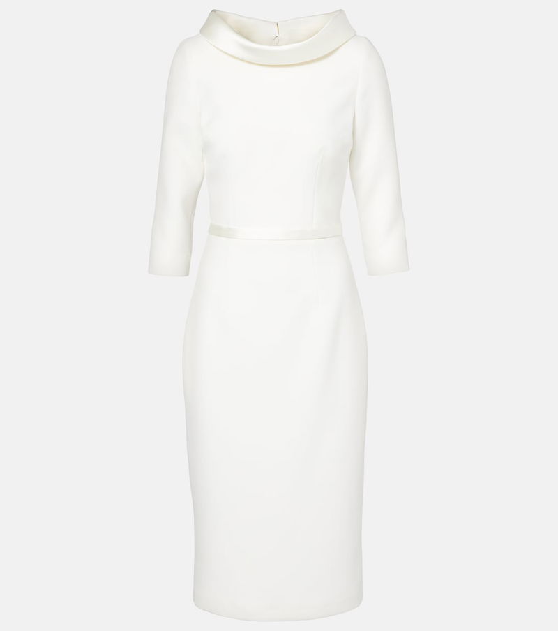 Timeless yet modern, the Meryl midi dress features a minimalist silhouette with elbow-length sleeves and a satin-trimmed neckline. This piece is made from Safiyaa's signature heavy crêpe – a fabric that is favored for its graceful draping qualities.