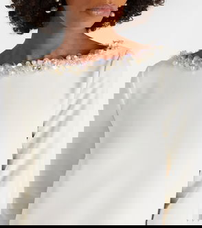 Finished with a statement feather trim at the hem, this elegant gown has a crew neck and long sleeves. This piece is made from Safiyaa's signature heavy crêpe – a fabric that is favored for its graceful draping qualities.