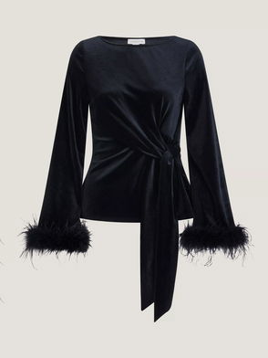 This piece is made from Safiyaa's signature heavy crêpe – a fabric that is favored for its graceful draping qualities. Trimmed at the cuffs with a decadent display of feathers, this top is a wishlist must-have.
