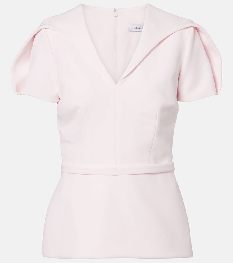 Featuring the Jonia belt detail, the Leighton top has an extra fold around the shoulders, referencing the brand's caped styles. This piece is made from Safiyaa's signature crêpe – a fabric favored for its graceful draping qualities.