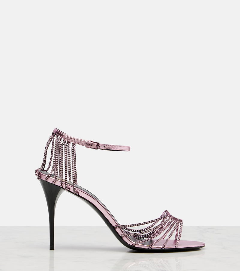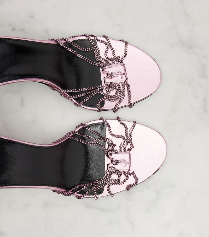 Since its conception in 1961, Saint Laurent has been coveted for its elegant Parisian aesthetic. Finished with metallic leather trims, the Babylone sandals are defined by their chain-link construction, 90mm stiletto heels, and signature monogram hardware.