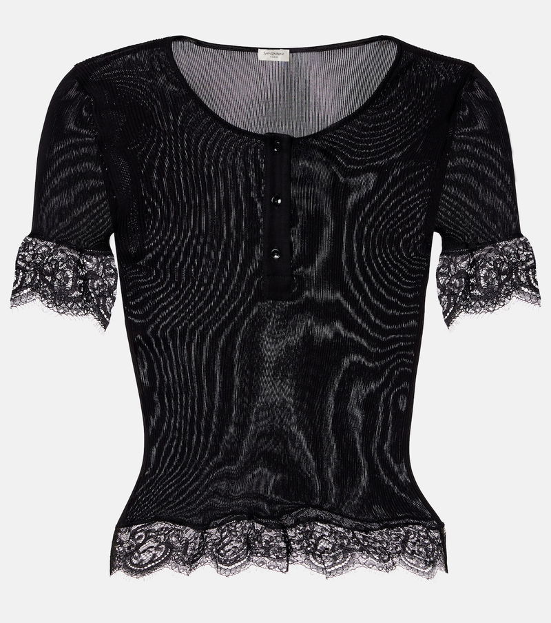 Since its conception in 1961, Saint Laurent has been coveted for its elegant Parisian aesthetic. This slim-fit top is ribbed-knit from pure silk jersey with delicate, scalloped lace trims.