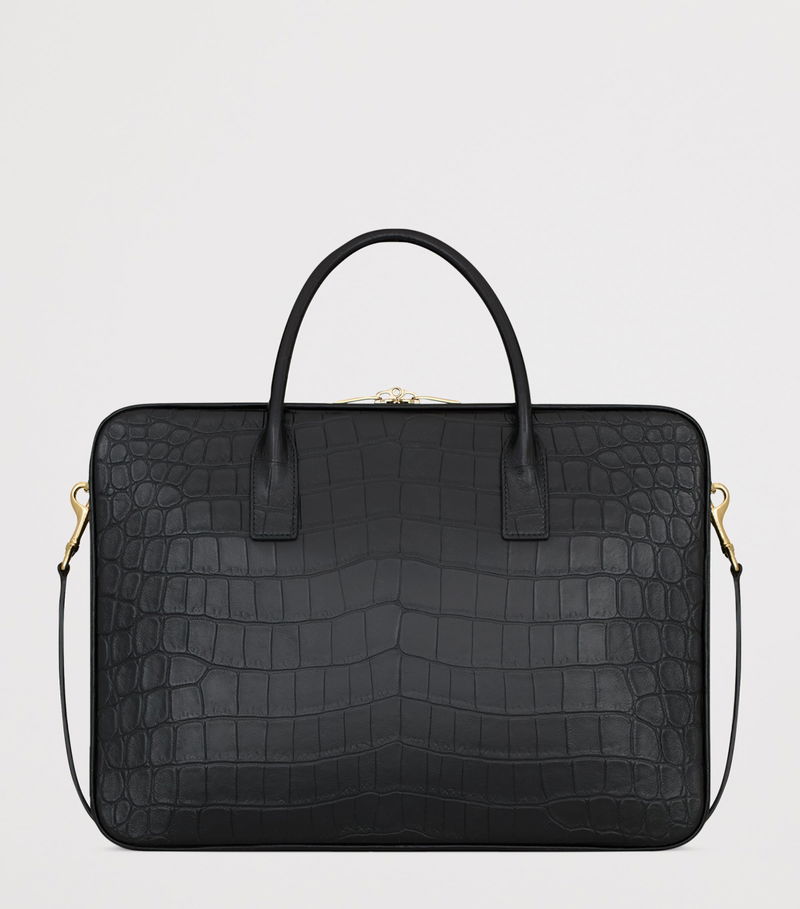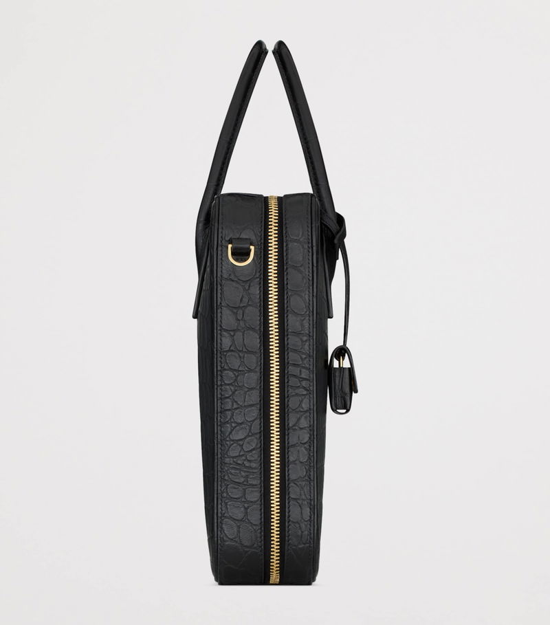Saint Laurent's Sac de Jour bauletto messenger bag combines structured elegance with practical design, crafted as it is in textured alligator skin and defined by the iconic padlock.