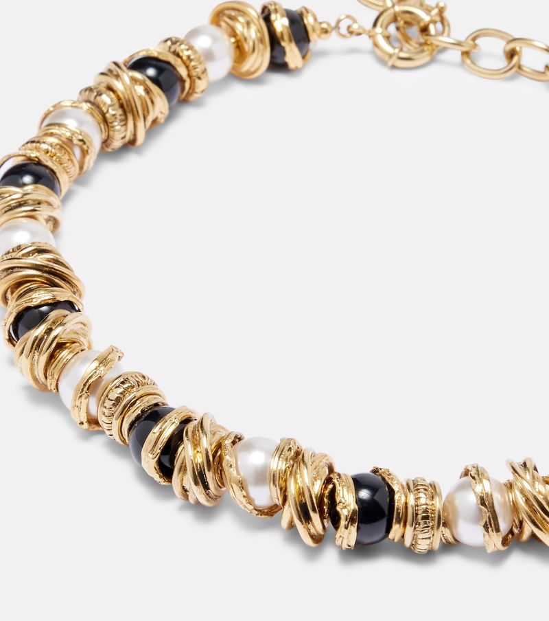 Since its conception in 1961, Saint Laurent has been coveted for its elegant Parisian aesthetic. The Loulou bracelet boasts the house's signature Cassandre hardware, faux pearls, and hammered, twisted, and coiled metal disks.