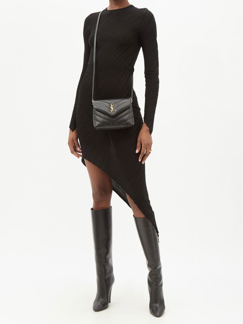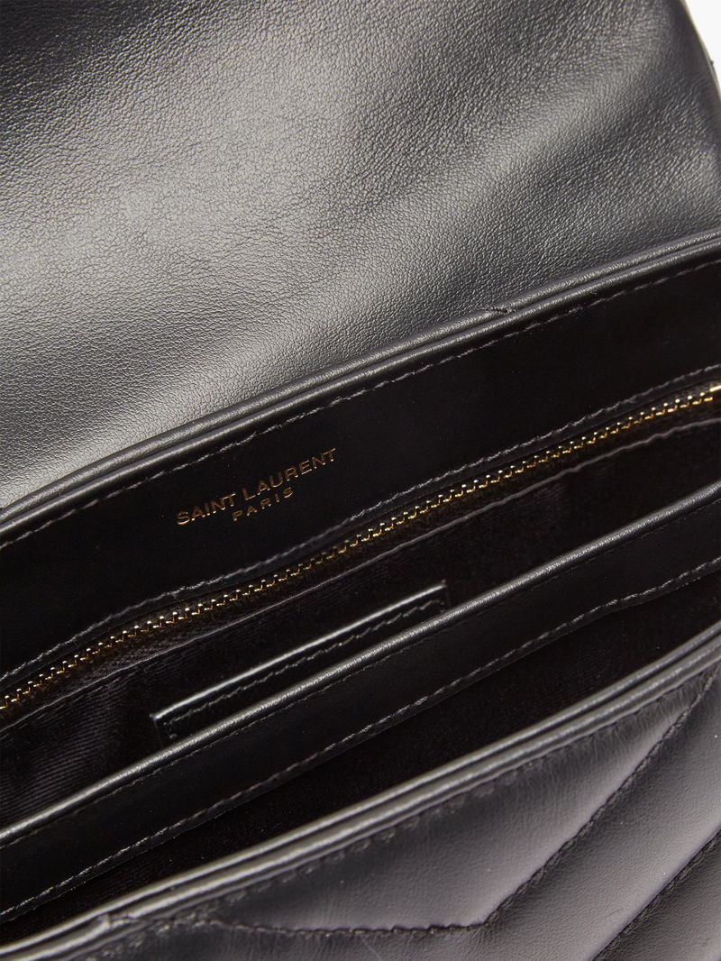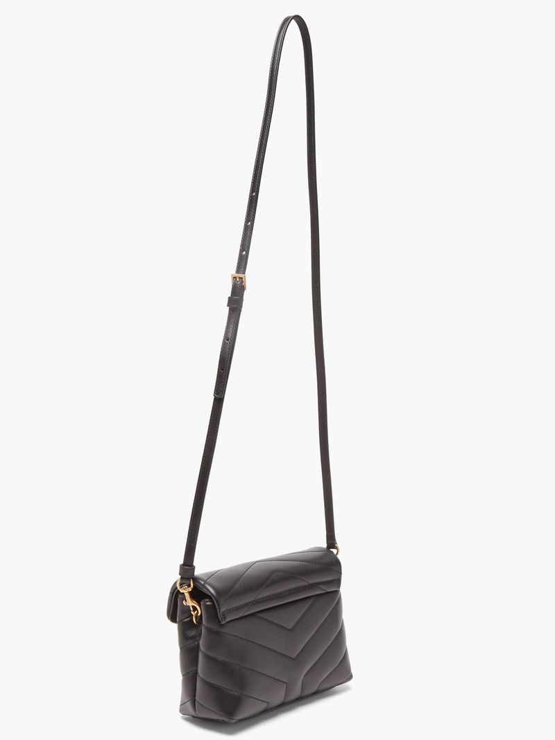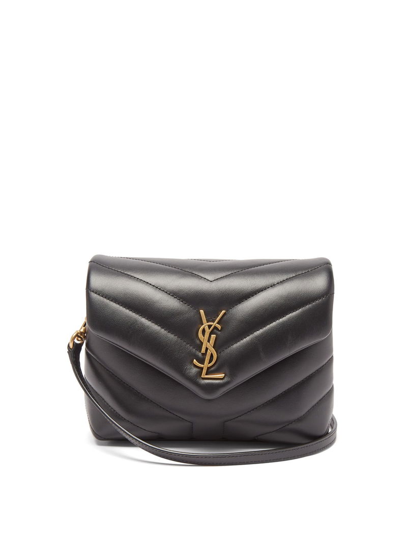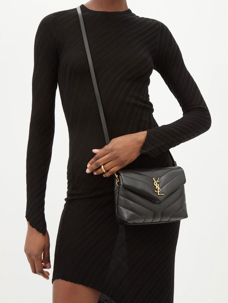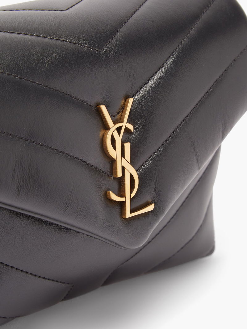 The quilted leather of Saint Laurent's black Loulou Toy mini bag marks out the letter Y in its stitching, framed with a 1960s Cassandre plaque.
