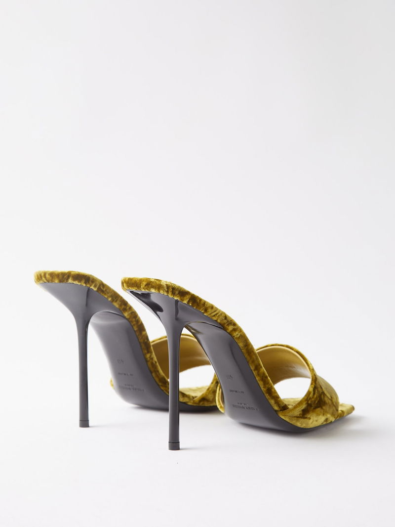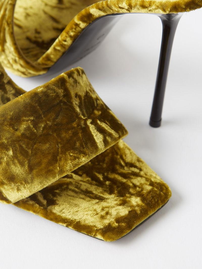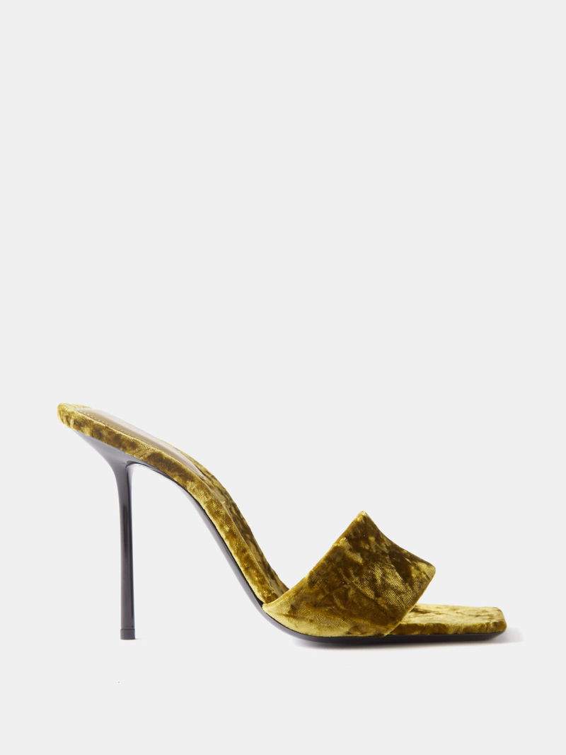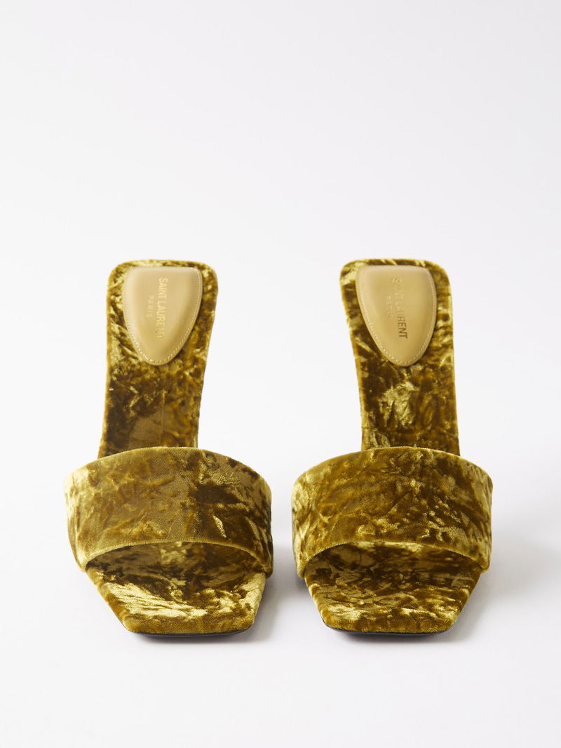 Rendered in crushed velvet, Saint Laurent’s ochre-yellow Lucky mules are formed with a square, open toe and set on a high heel with a leather sole.