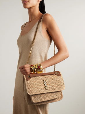 The Niki Medium shoulder bag reimagines a house icon in raffia, blending relaxed texture with refined, structured design.