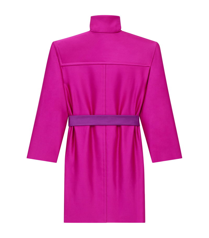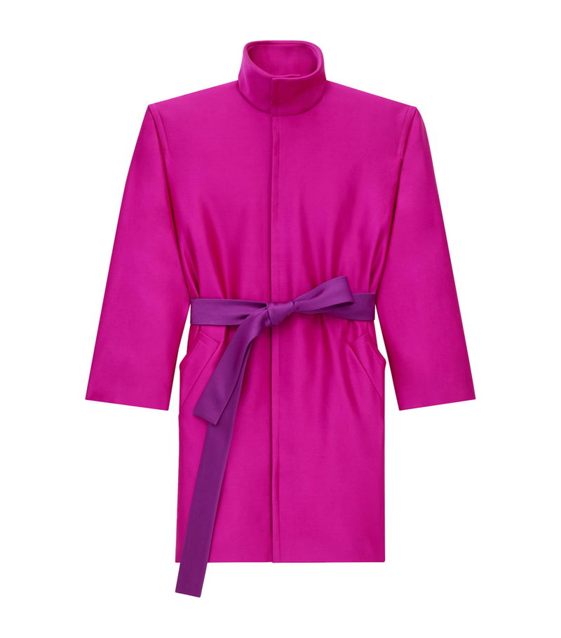 Saint Laurent's belted coat reinterprets heritage tailoring reminiscent of early House codes with effortless precision. Crafted from certified silk, the piece features exaggerated, structured shoulders and a stand collar, while the contrasting belt cinches the waist and gives the boxy silhouette a striking, contemporary edge.