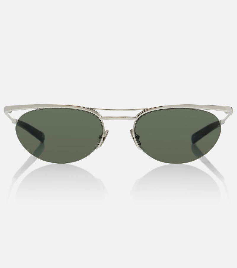 The SL 862 sunglasses from Saint Laurent feature a sleek, minimalist silhouette highlighted by a distinctive double-bridge design. The pair features rounded grey-hued lenses and thin temples with a debossed signature logo.