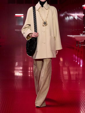 A double-breasted design in a long-line silhouette, Saint Laurent's coat is the kind of piece that never goes out of style. It's made from a heavyweight, wool-blend gabardine with shoulder pads and epaulettes that create a structured shape.