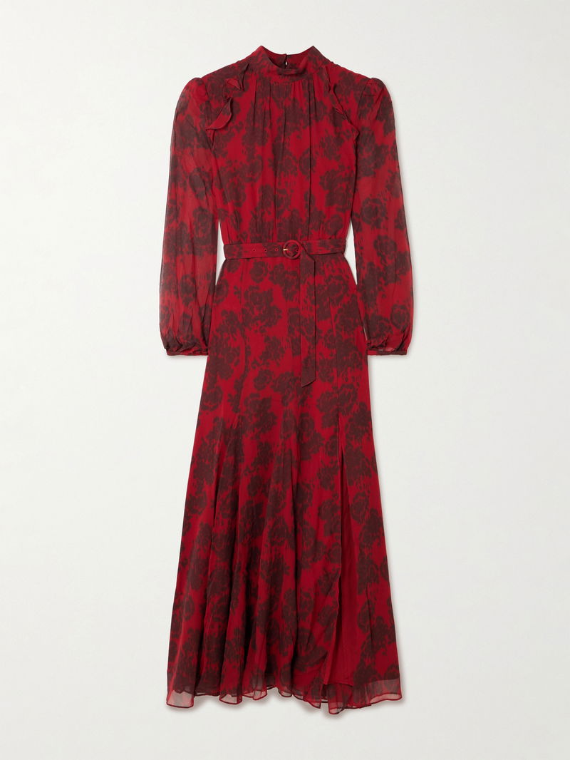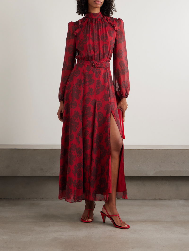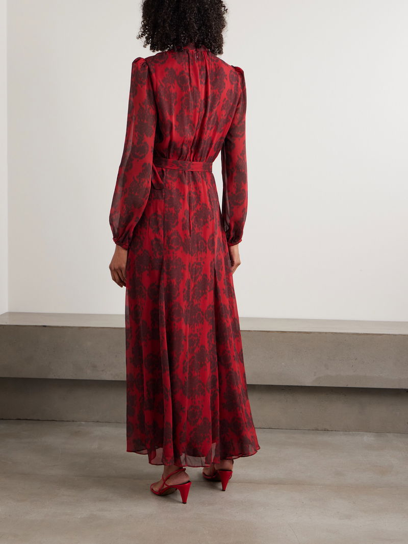 Saloni's designs are created to empower you to "experience the joy of living life in different hues." Decorated in a pretty rose motif, this 'Jacqui-B' maxi dress is cut from silk crepe de chine with puffed sleeves and a gathered high neckline.