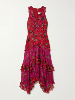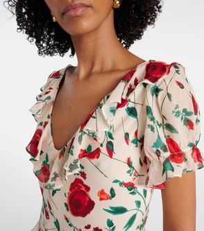 Saloni's 'Lea' maxi dress is cut on the bias from lightweight silk crepe de chine for a fluid drape. It's patterned with bold florals and has red trims that outline the shape. Adjust the belt to gently cinch your waist.