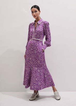 Saloni often updates its 'Lea' dress in different seasonal prints. This version is cut from smooth silk-satin that's lightly gathered through the bust and along the puffed sleeves. A dainty chain necklace will pull focus to the V-neckline and delicate covered buttons.