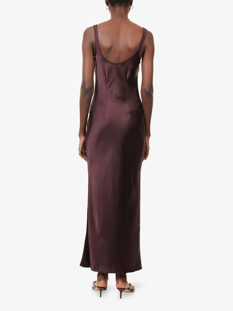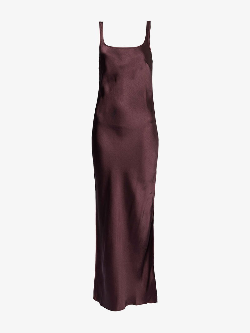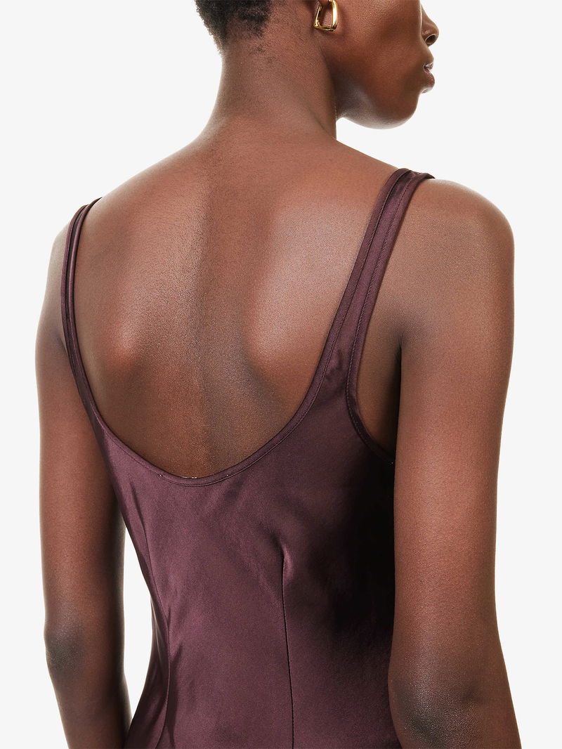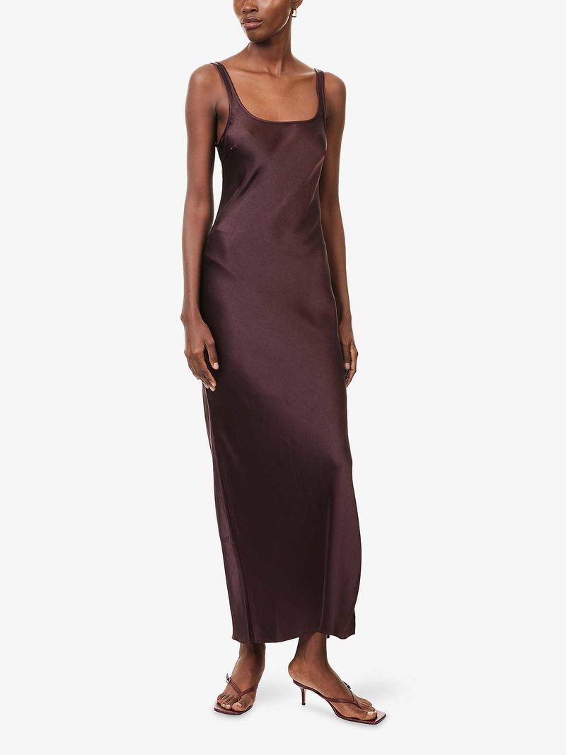 Samsøe Samsøe woven midi dress. Slim fit, square-neck, shoulder straps, all-over satin texture, split at side. Lightweight, stretchy.