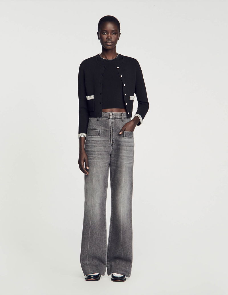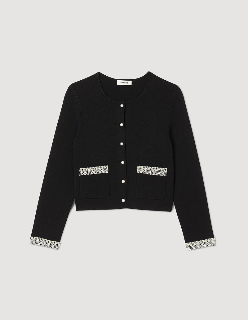 Knit cardigan with long sleeves and a round neck decorated with a beaded button fastening and pearly beads on the cuffs and waist.