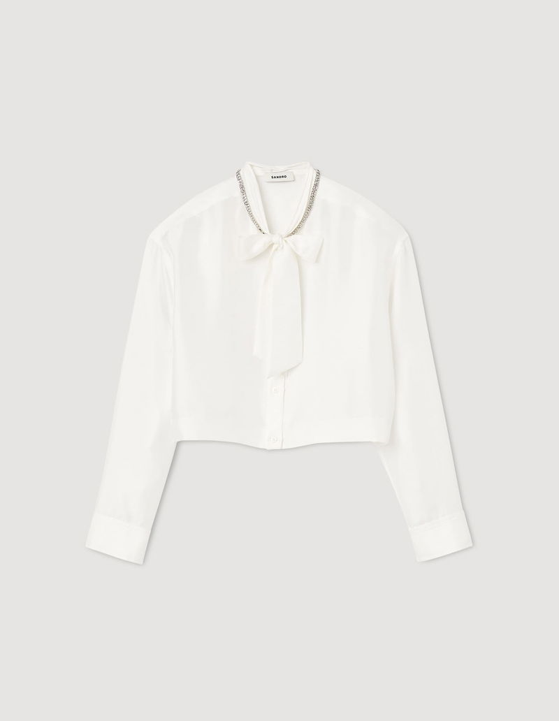 Silk twill cropped shirt with a tie collar embellished with rhinestones, long sleeves and topstitched details.
