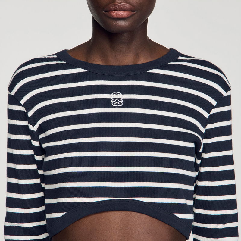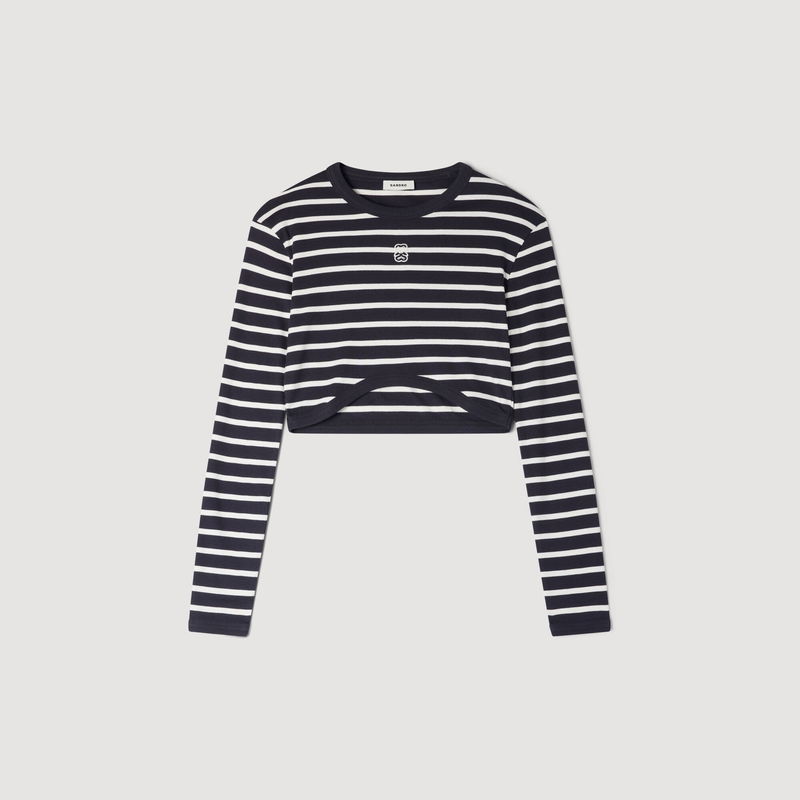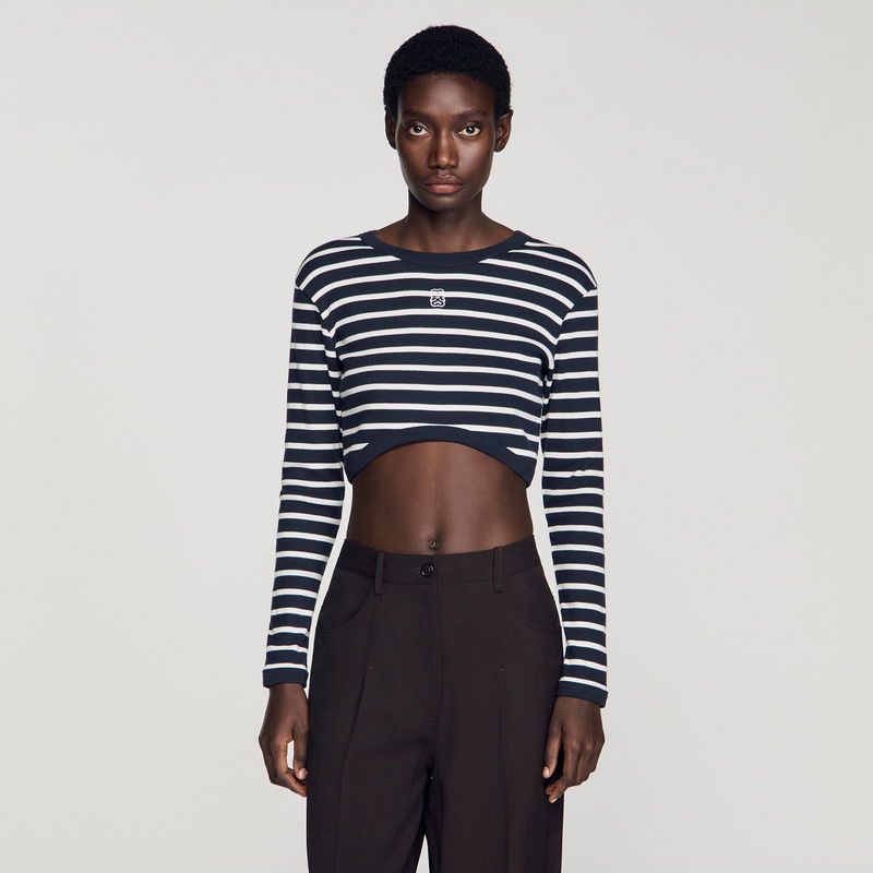 Cropped striped T-shirt with a round neck and long sleeves.