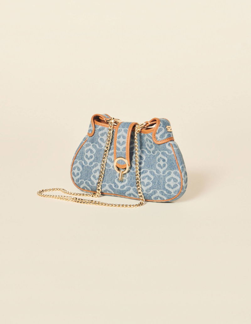 Denim and contrasting leather bag. Denim printed with the double S logo. Graphic clasp fastening. Leather and cotton lining. Sandro leather patch. Metal chain shoulder strap. Magnetic fastening. Inside pocket.