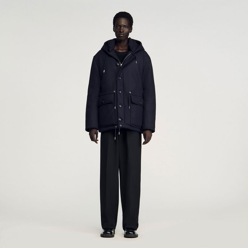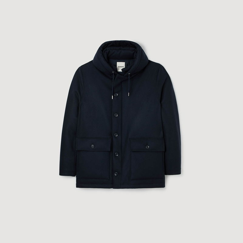 Padded wool parka with hood, button and zip fastening, and drawstrings at the bottom.
