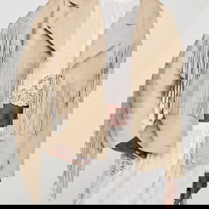 Gabardine jacket with corduroy collar, long sleeves with beaded detail on armholes, zip fastening and patch pockets.