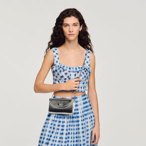 Shoulder or sling bag in contrasting canvas and leather, with signature clasp and chain handle.