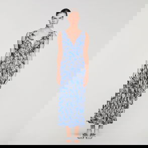 Long dress in multi-stitch knit with straps and a flared skirt at the bottom.