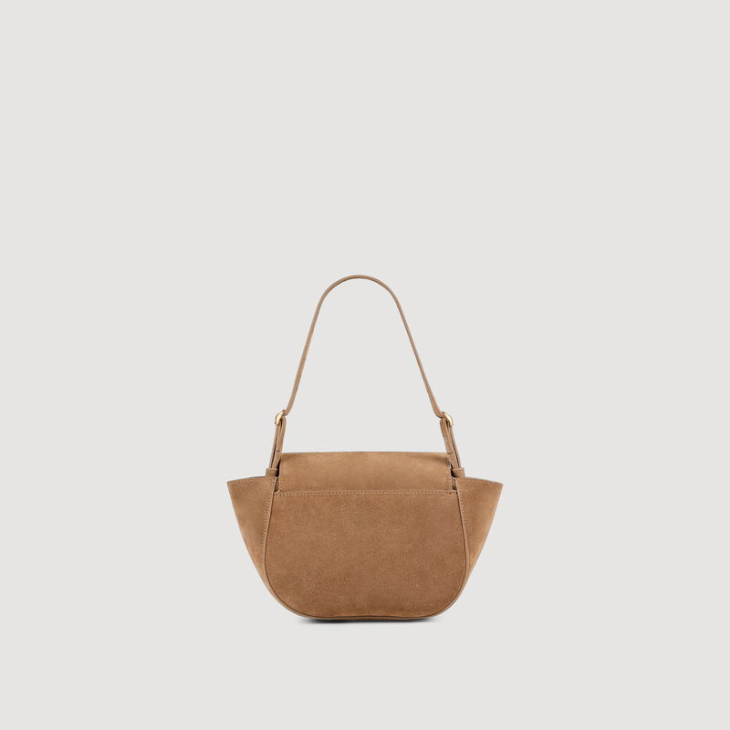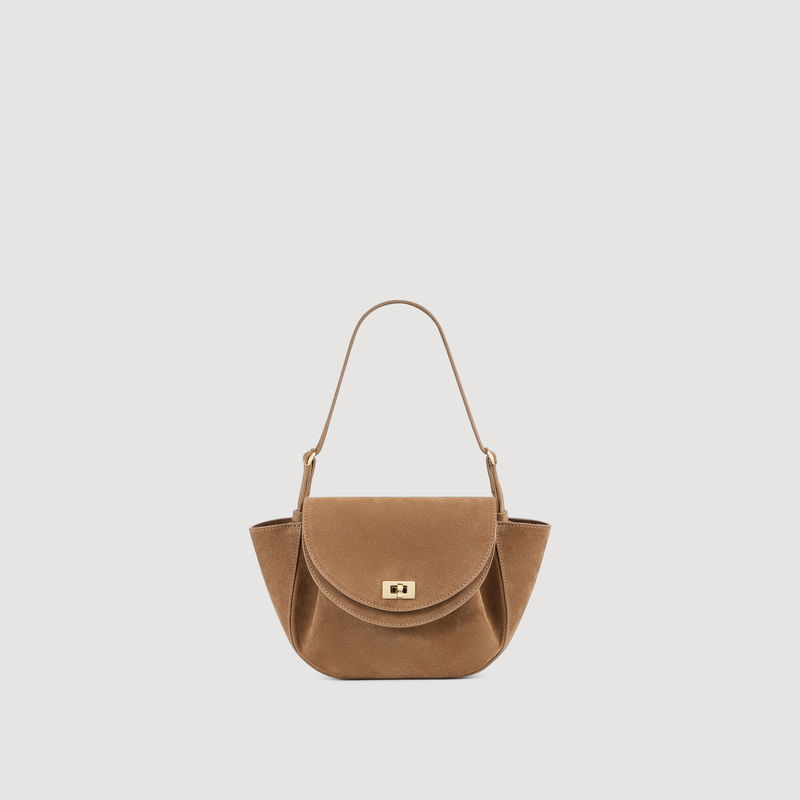 Plain suede bag with a double flap and a removable chain strap, for carrying by hand, on the shoulder or across the body.