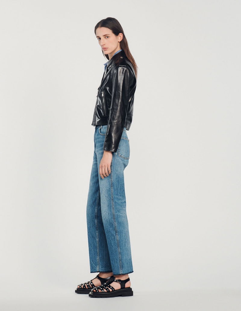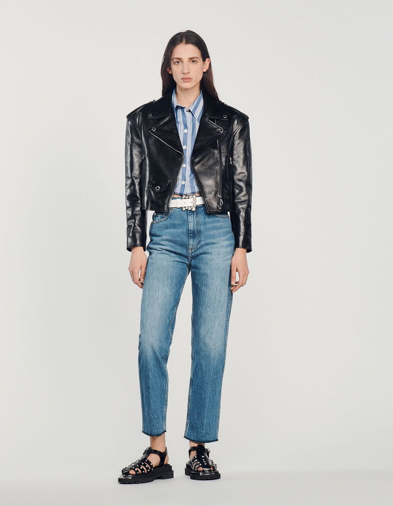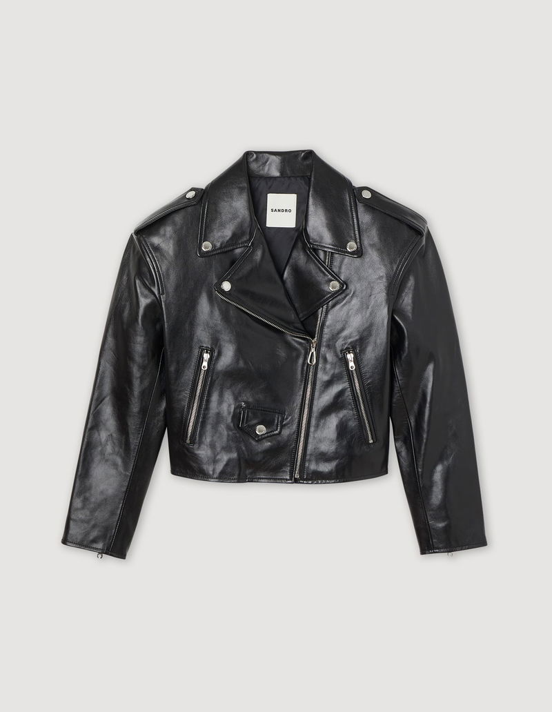 Leather jacket with oversized voluminous shoulders, long sleeves, 2 zip pockets and an asymmetrical zip fastening on the front.