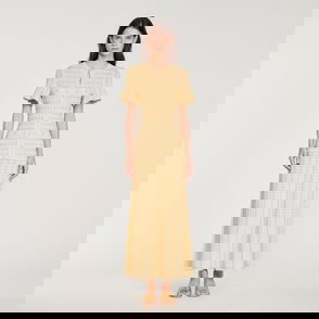 Sleeveless stretch-knit maxi dress with round neck, button placket, pleated skirt, patch pockets and contrasting crochet detailing on edges and pockets
