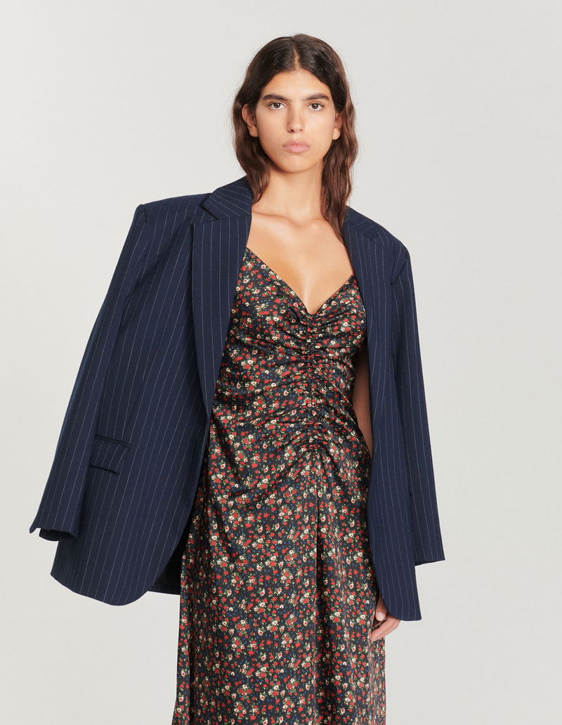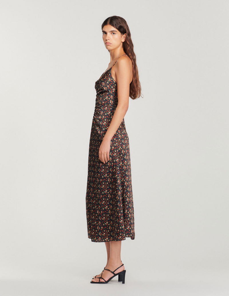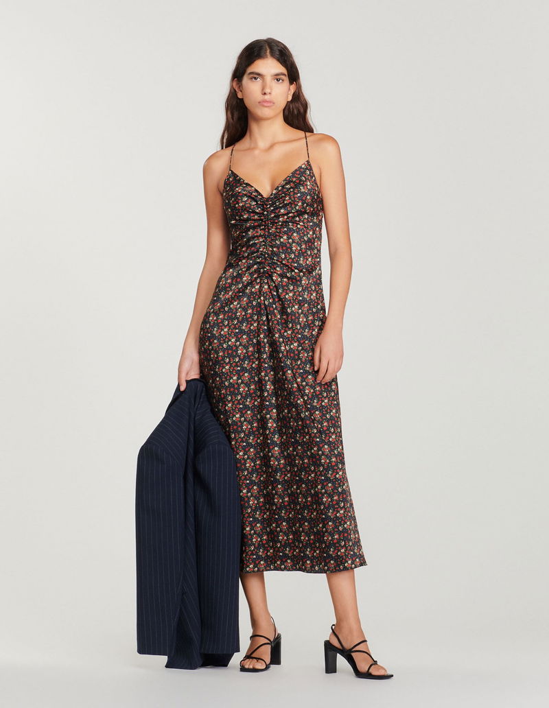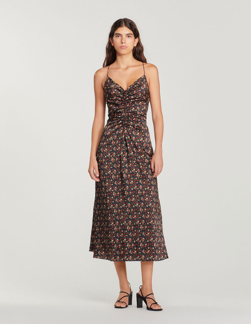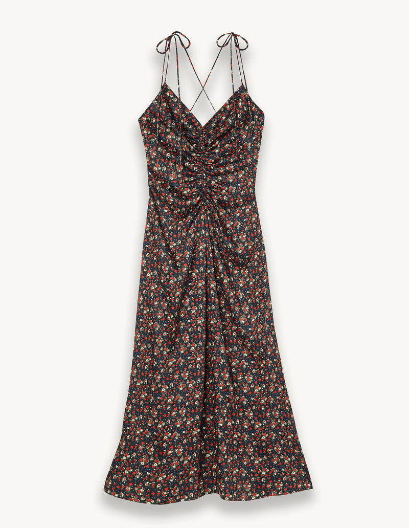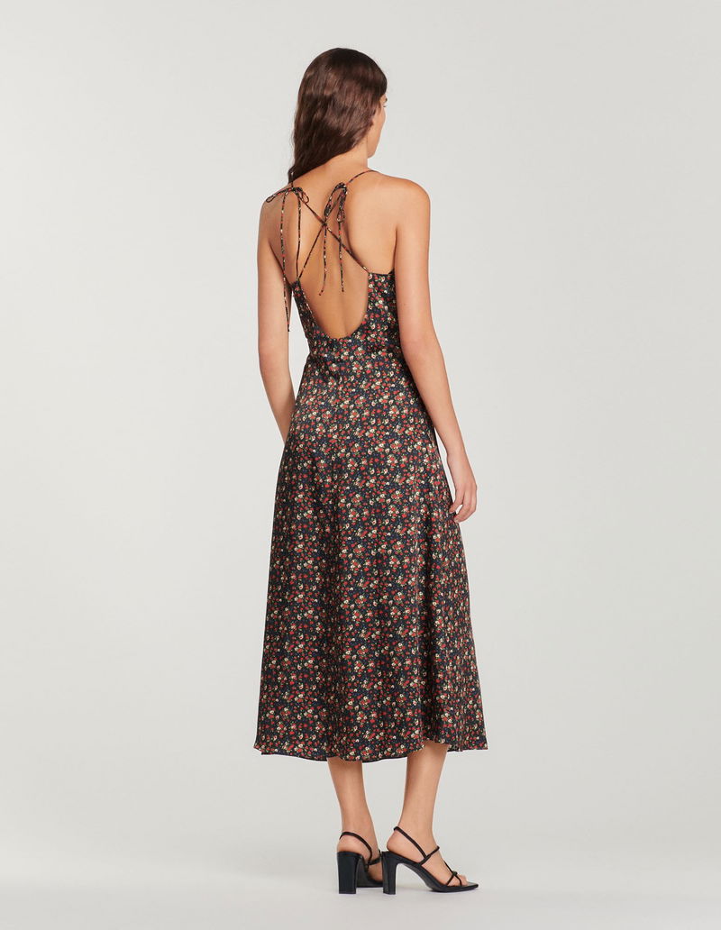 Floral midi dress with narrow crossover straps, tied at the back, and drawstring ties at the front.