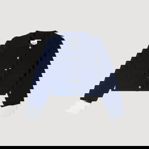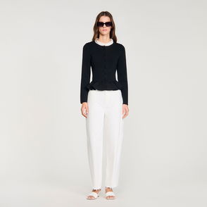 Sandro women’s cardigan. Long houndstooth cardigan. Contrasting trim. V-neck. Long sleeves. Chest and hip pockets with fancy buttons. Straight cut, loose fit. Ribbed trims. Button placket fastening at the front.