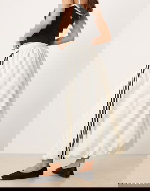 Long skirt with slits at the front, topstitching at the waist and a lace trim.